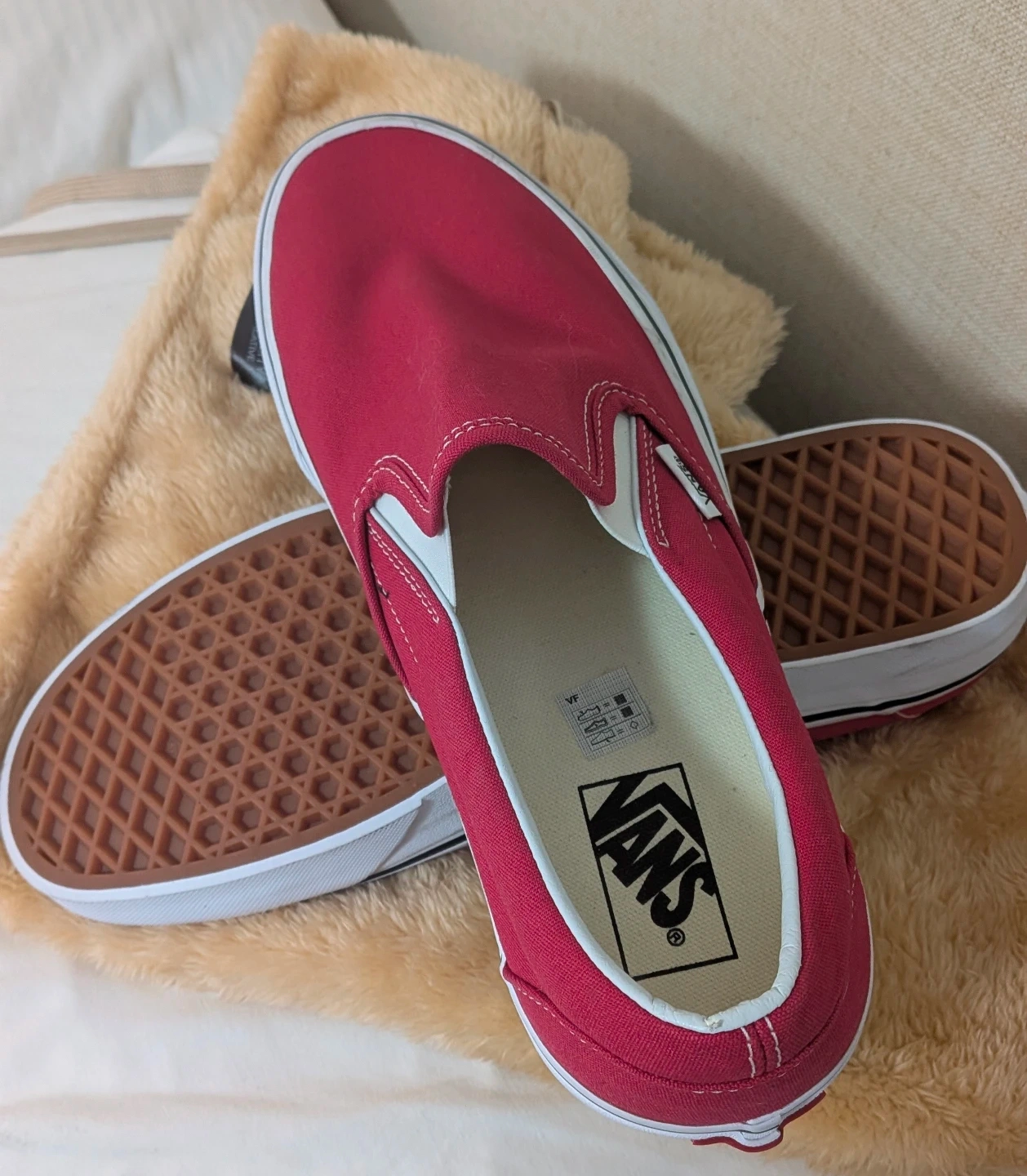 Classic Vans slip-on shoes in a vibrant red colour. Canvas upper with signature waffle sole. Easy to slip on and off!