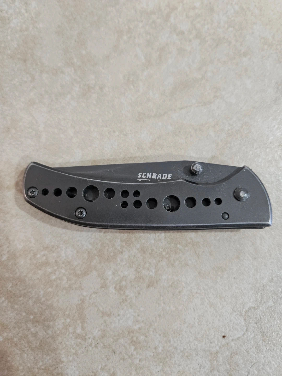 This is a Schrade Timer folding knife with a partially serrated blade. It has a grey metal handle with decorative cutouts. It includes a pocket clip on the back.