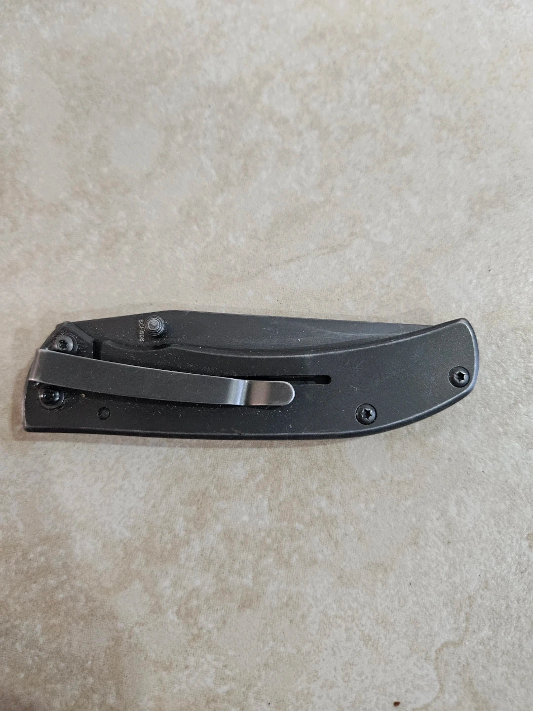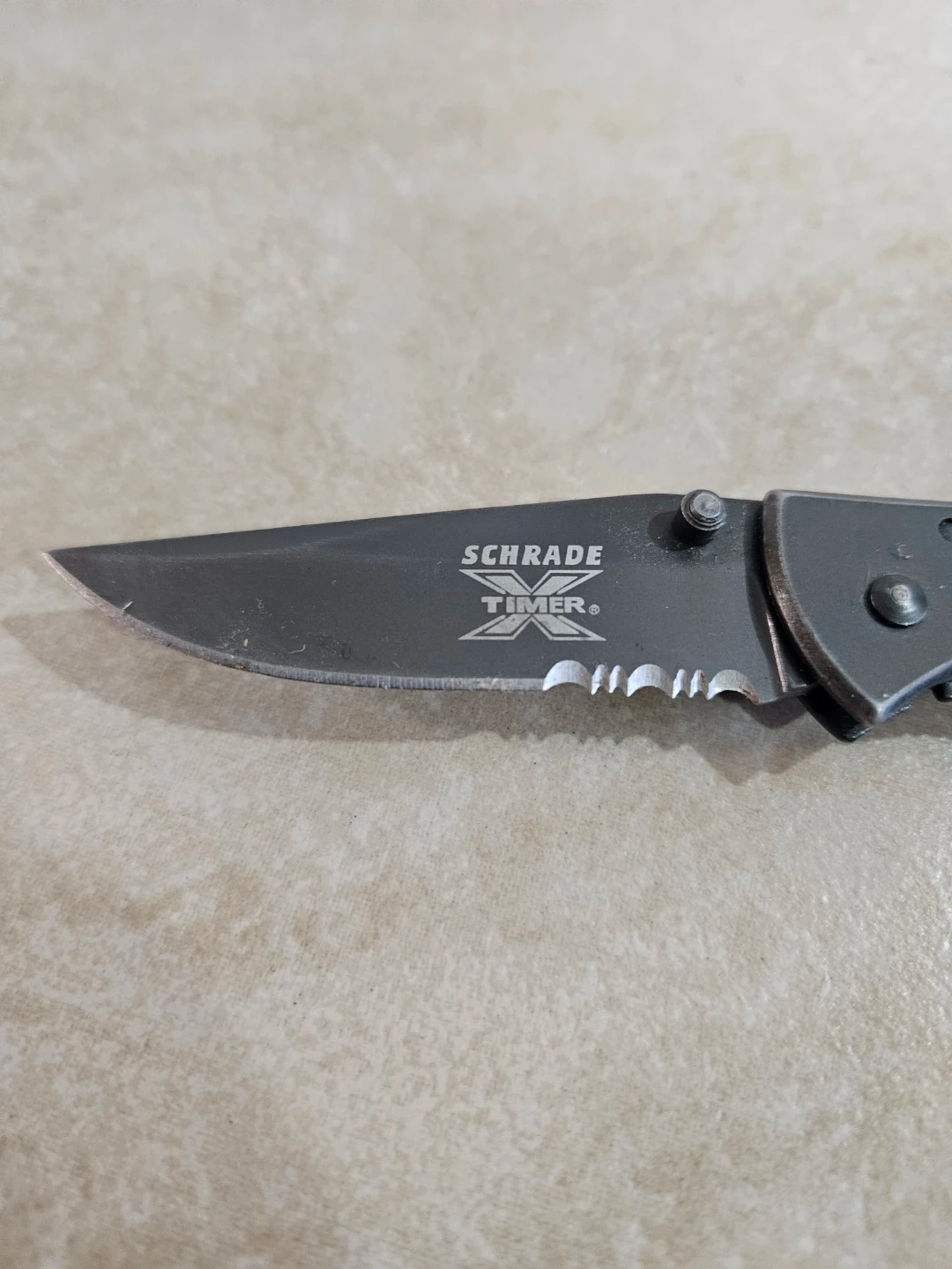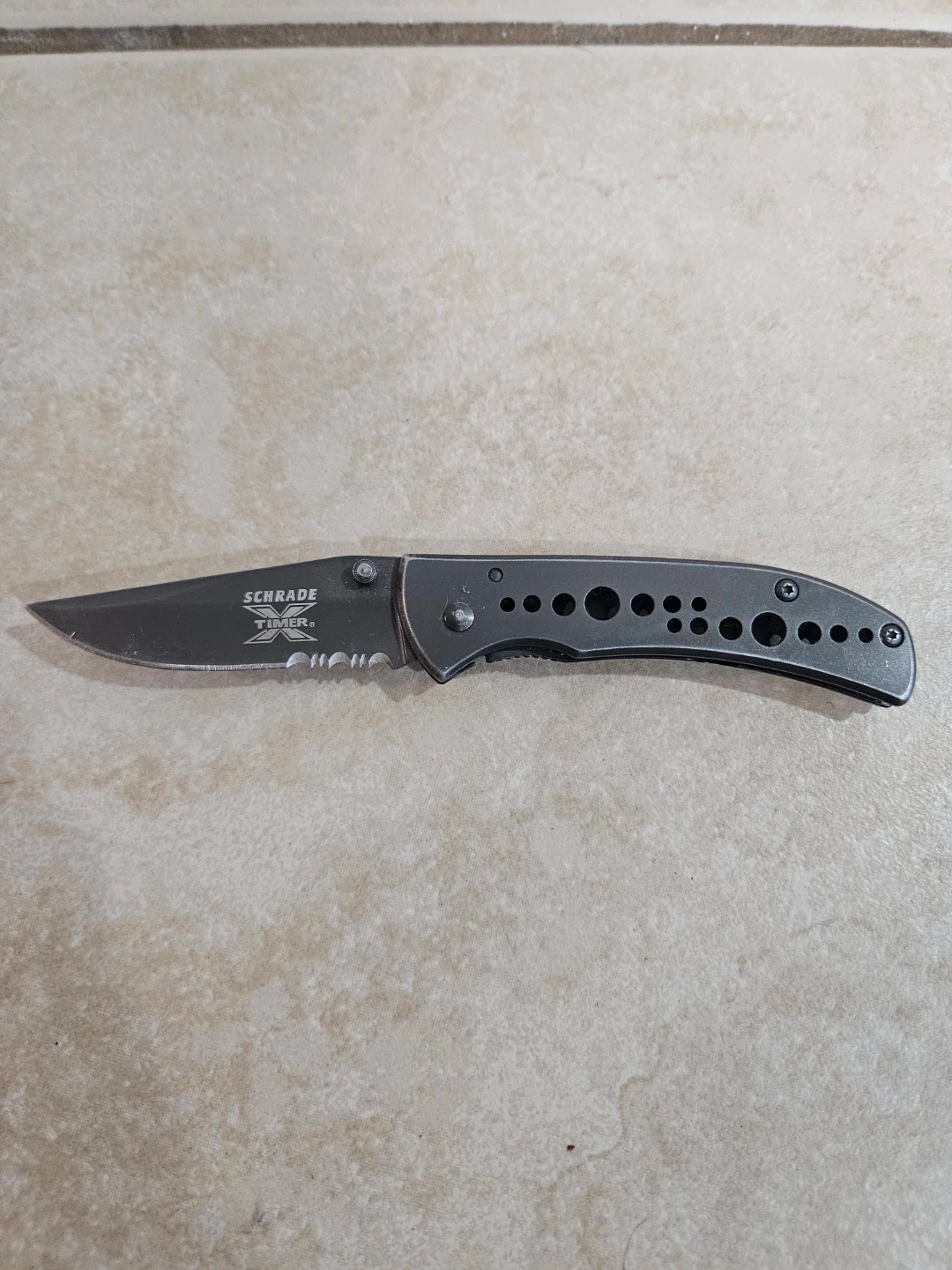 This is a Schrade Timer folding knife with a partially serrated blade. It has a grey metal handle with decorative cutouts. It includes a pocket clip on the back.