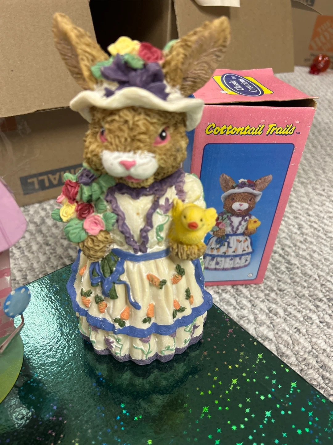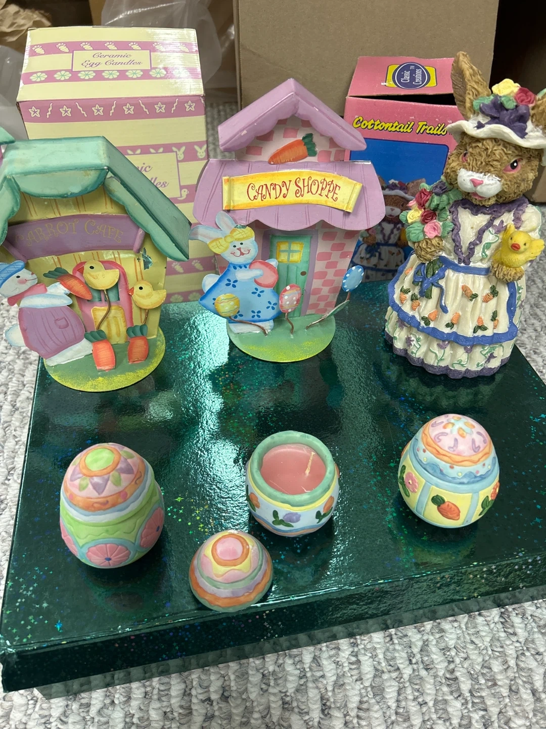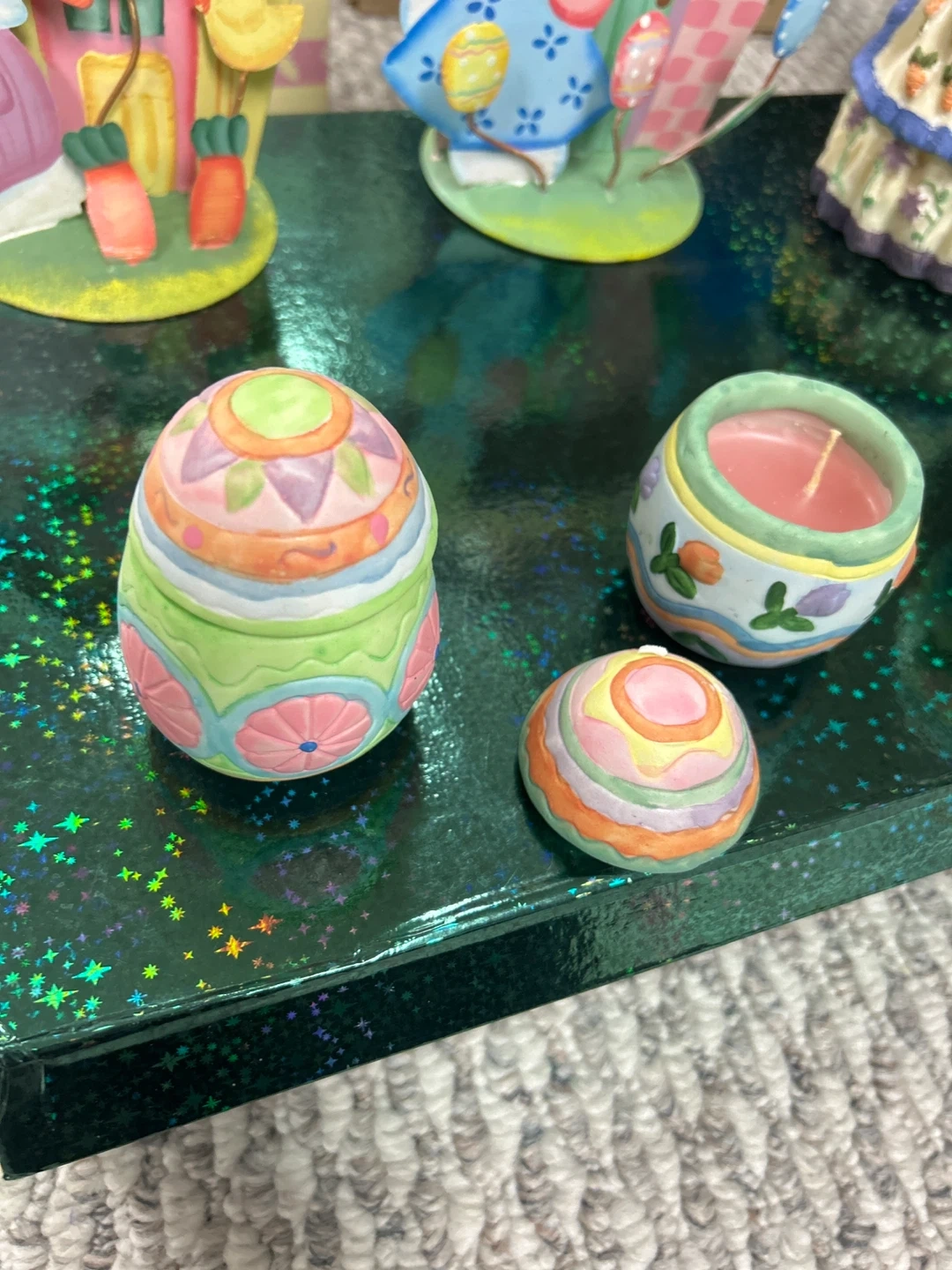 This set includes a collection of charming Easter-themed decorations. You'll find decorative eggs, a candle holder, and whimsical bunny figurines. These items add a festive touch to your spring decor!