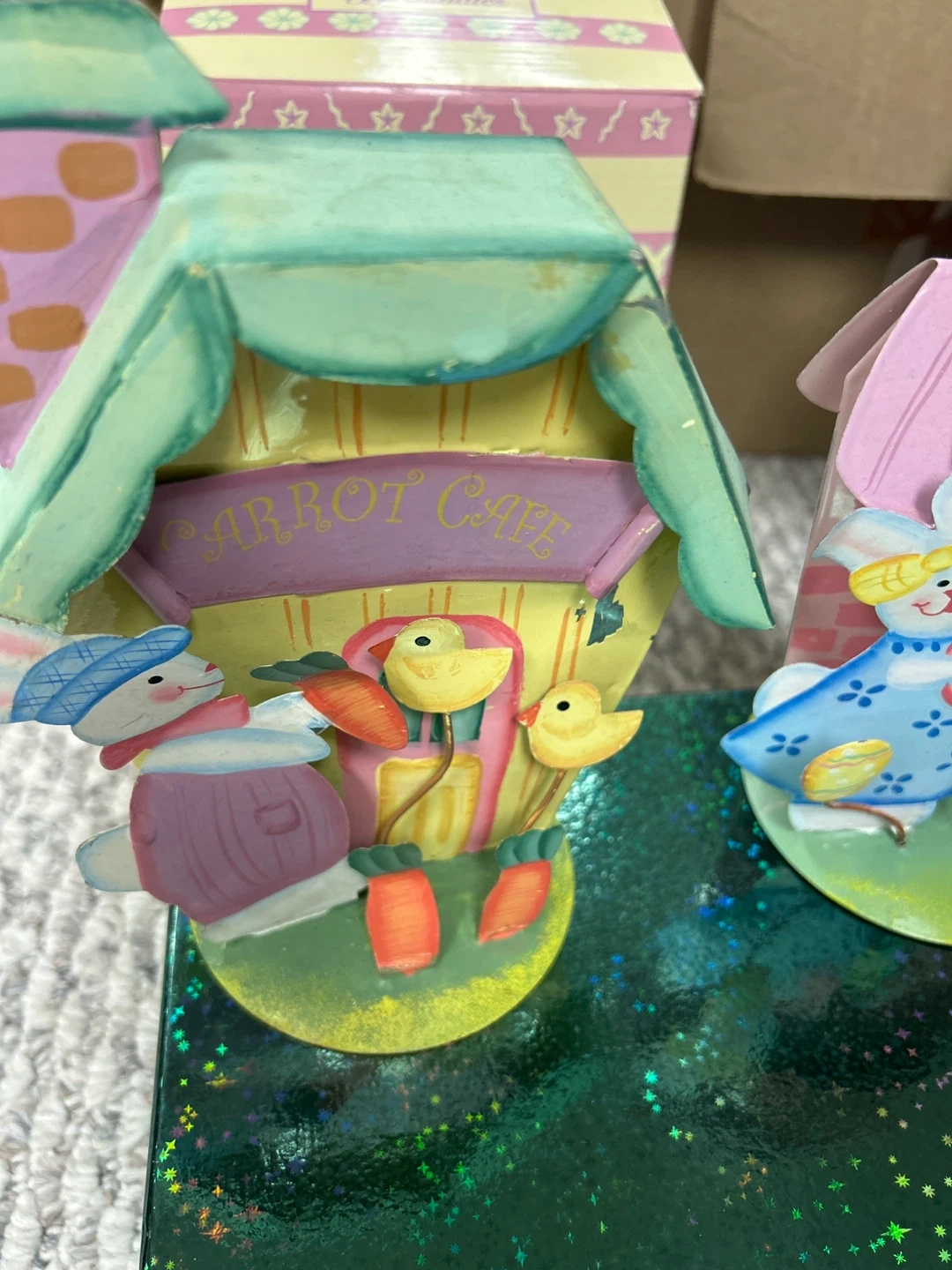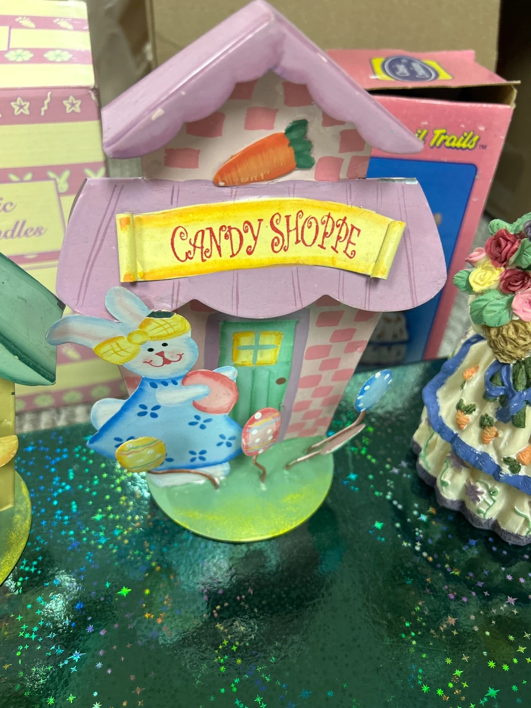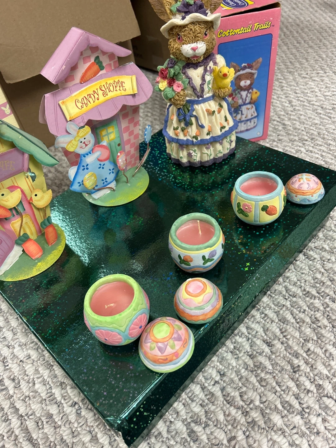 This set includes a collection of charming Easter-themed decorations. You'll find decorative eggs, a candle holder, and whimsical bunny figurines. These items add a festive touch to your spring decor!