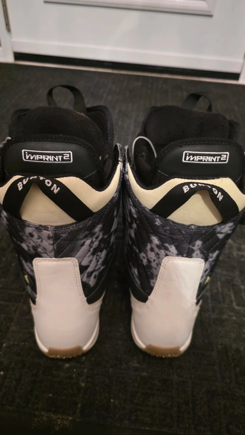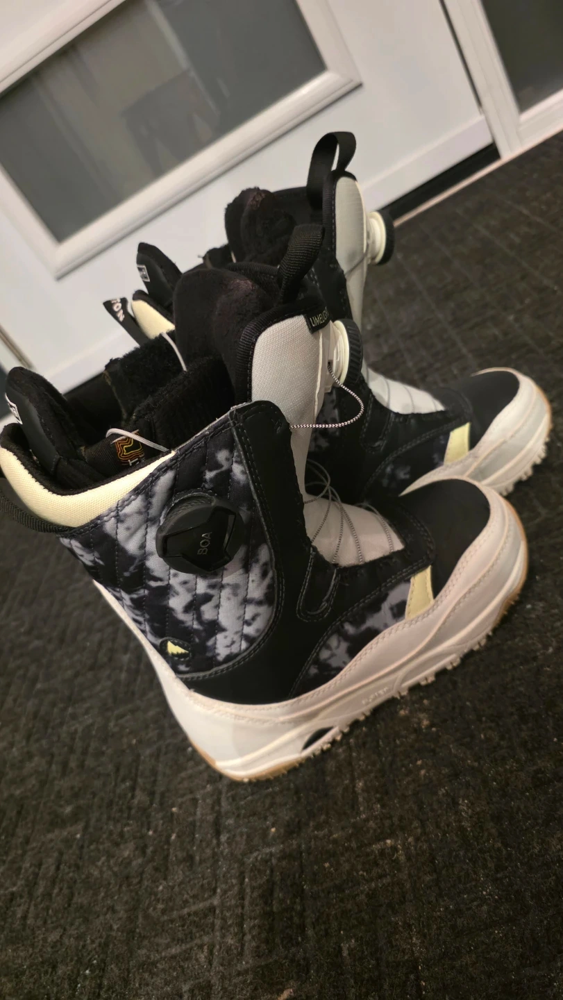 Women's size 4 (216cm) Burton Limelight snowboard boots with Double Boa lacing system. Imprint 2 liner. Features a black, white, and grey tie-dye design. These boots are perfect for hitting the slopes!v Lightly used 1 season only