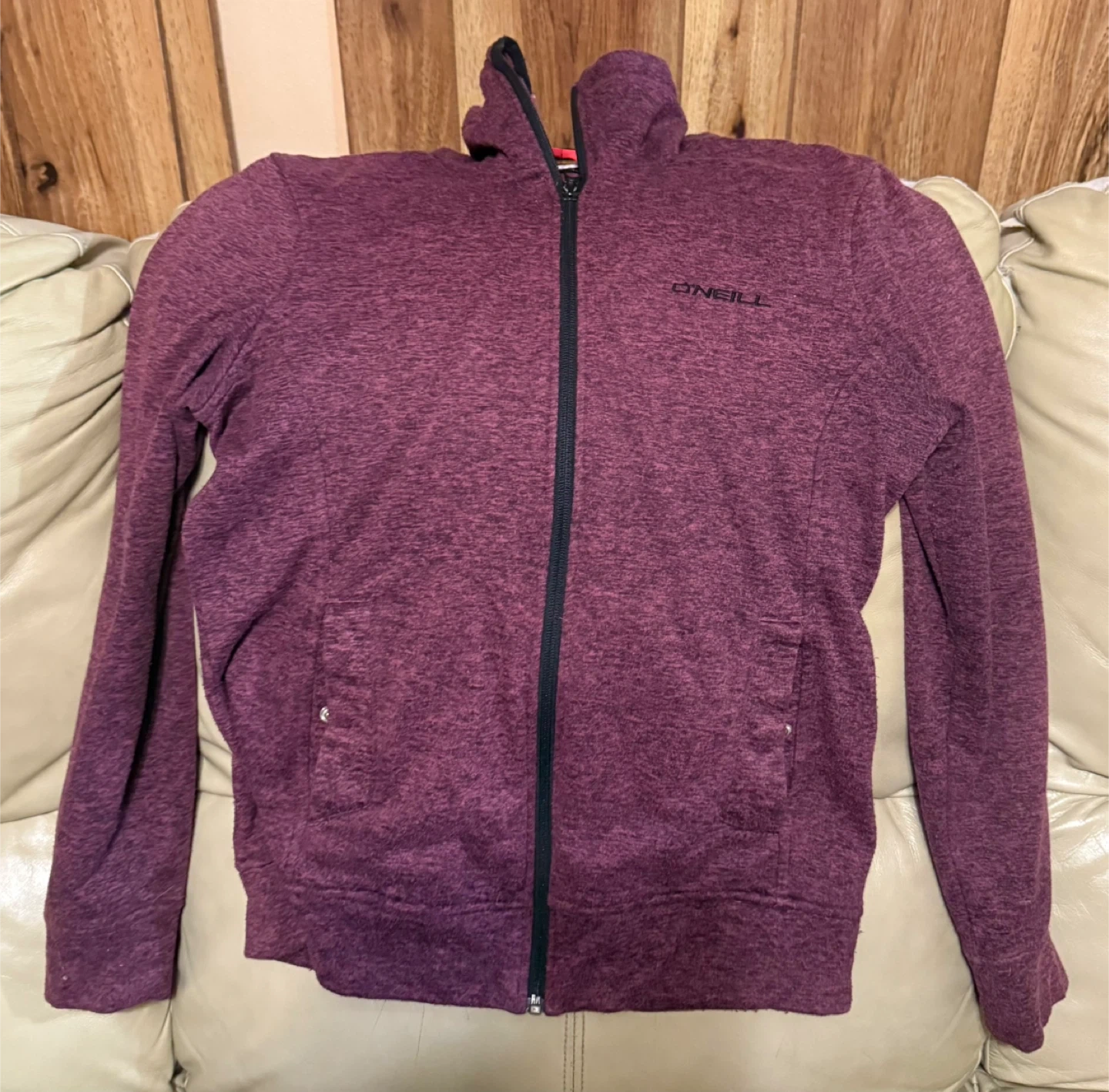 This O'Neill fleece zip-up jacket is a cosy maroon colour. It's labelled as size L. The jacket is made from a soft polyester blend, perfect for cooler days.
