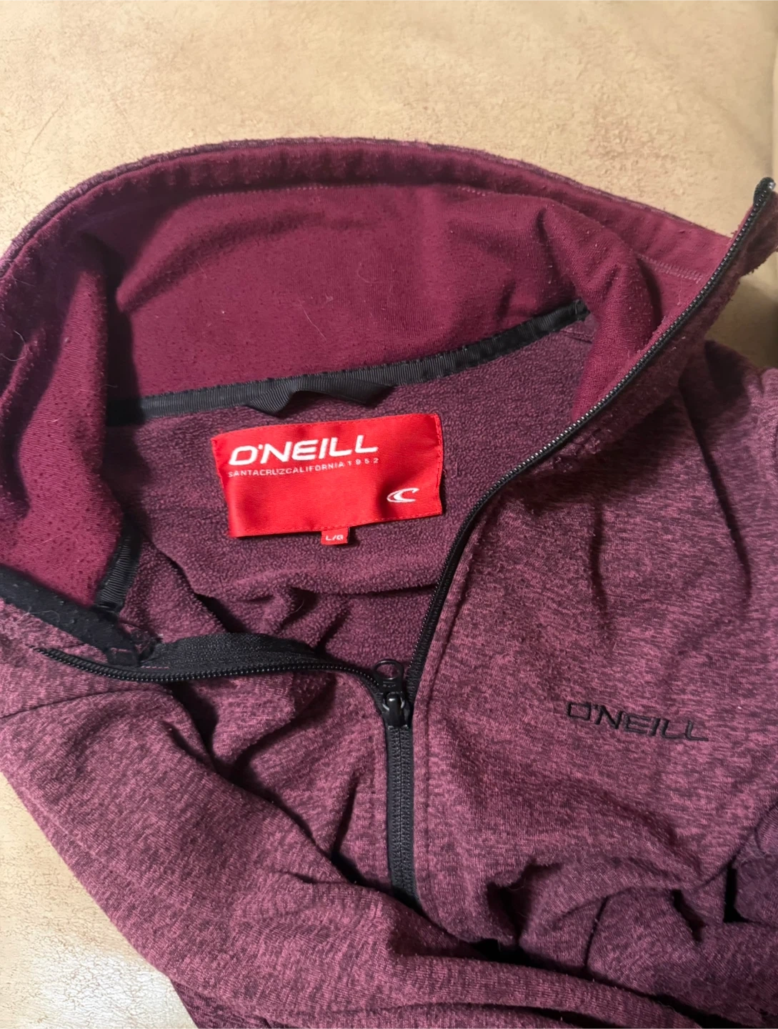 This O'Neill fleece zip-up jacket is a cosy maroon colour. It's labelled as size L. The jacket is made from a soft polyester blend, perfect for cooler days.