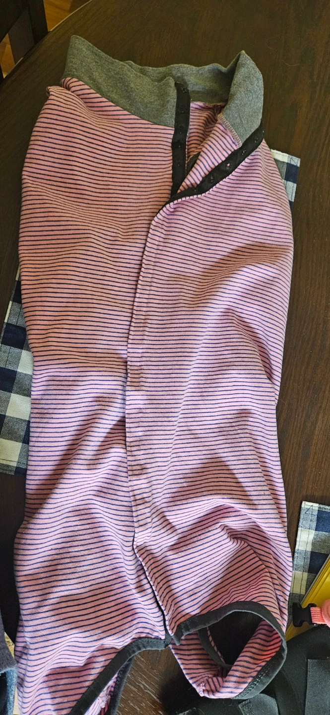 10Dog after surgery onsie in size XXXL! It's pink with dark stripes and grey trim. Your furry friend will look so cute in this and not have to wear the c9ne of shame. In great condition