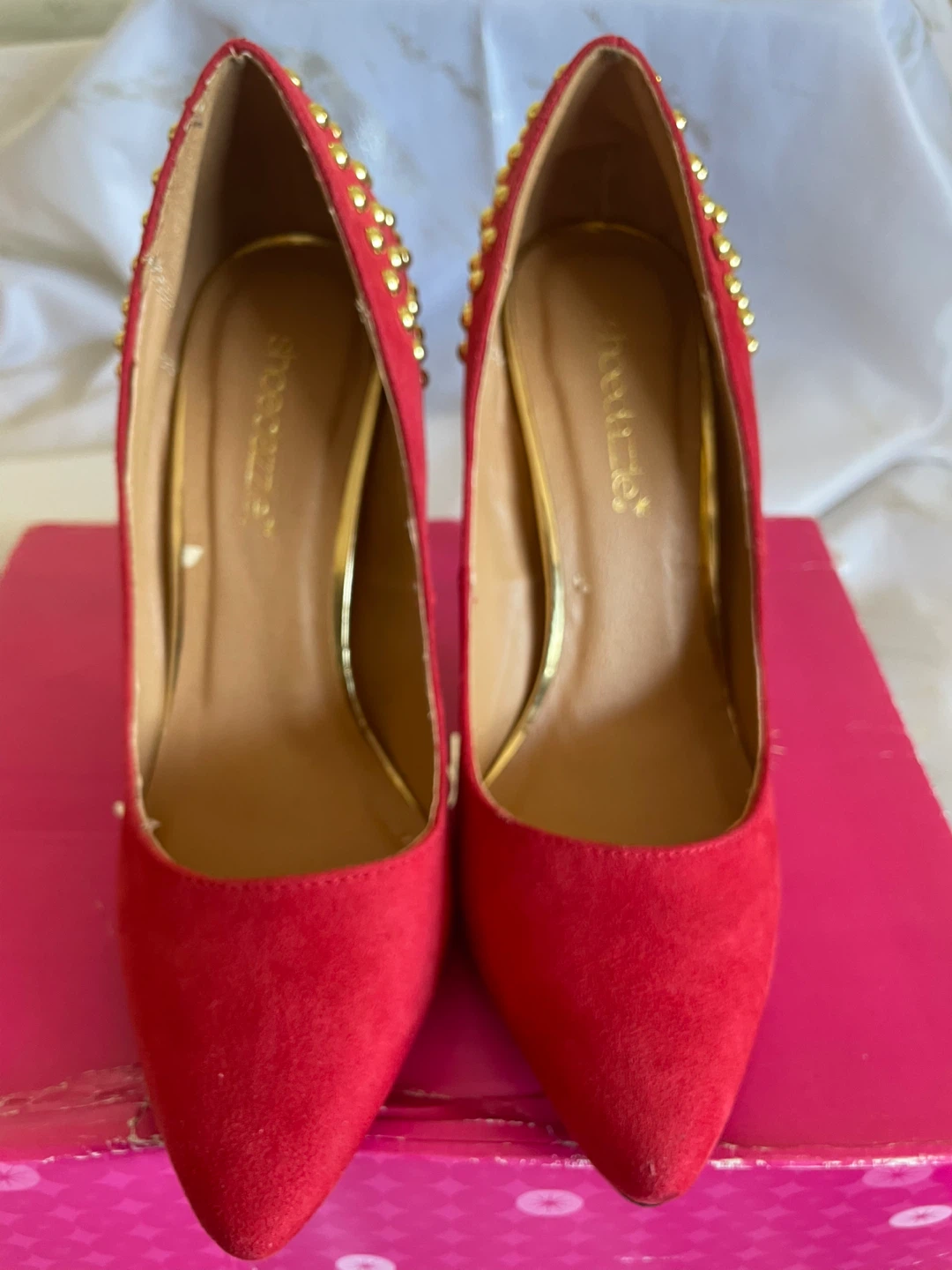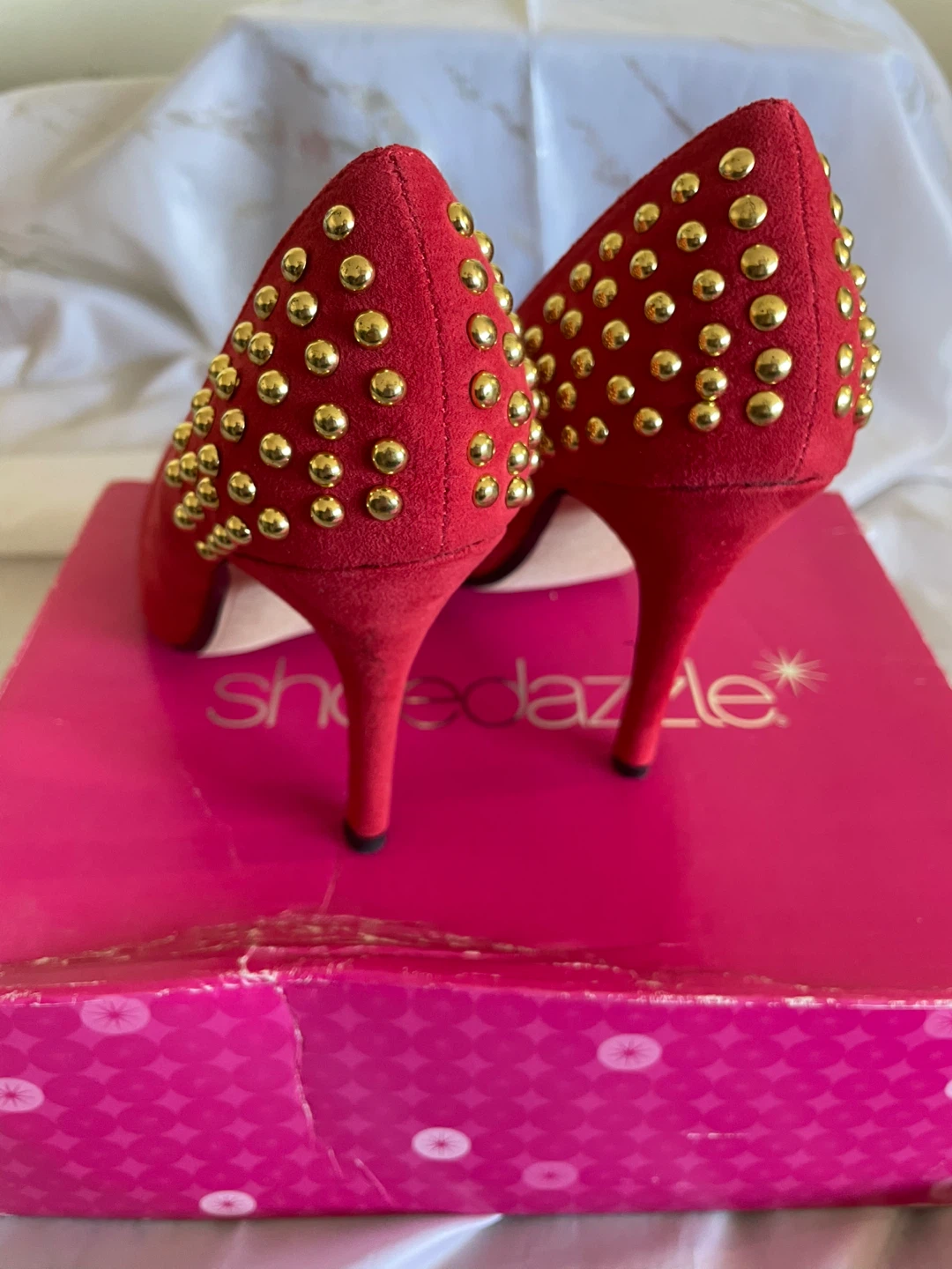 These Shoedazzle Viviana heels are a vibrant red suede with gold stud accents. They have a pointed toe and a stiletto heel. Size is 6 US. Comes with the original box.