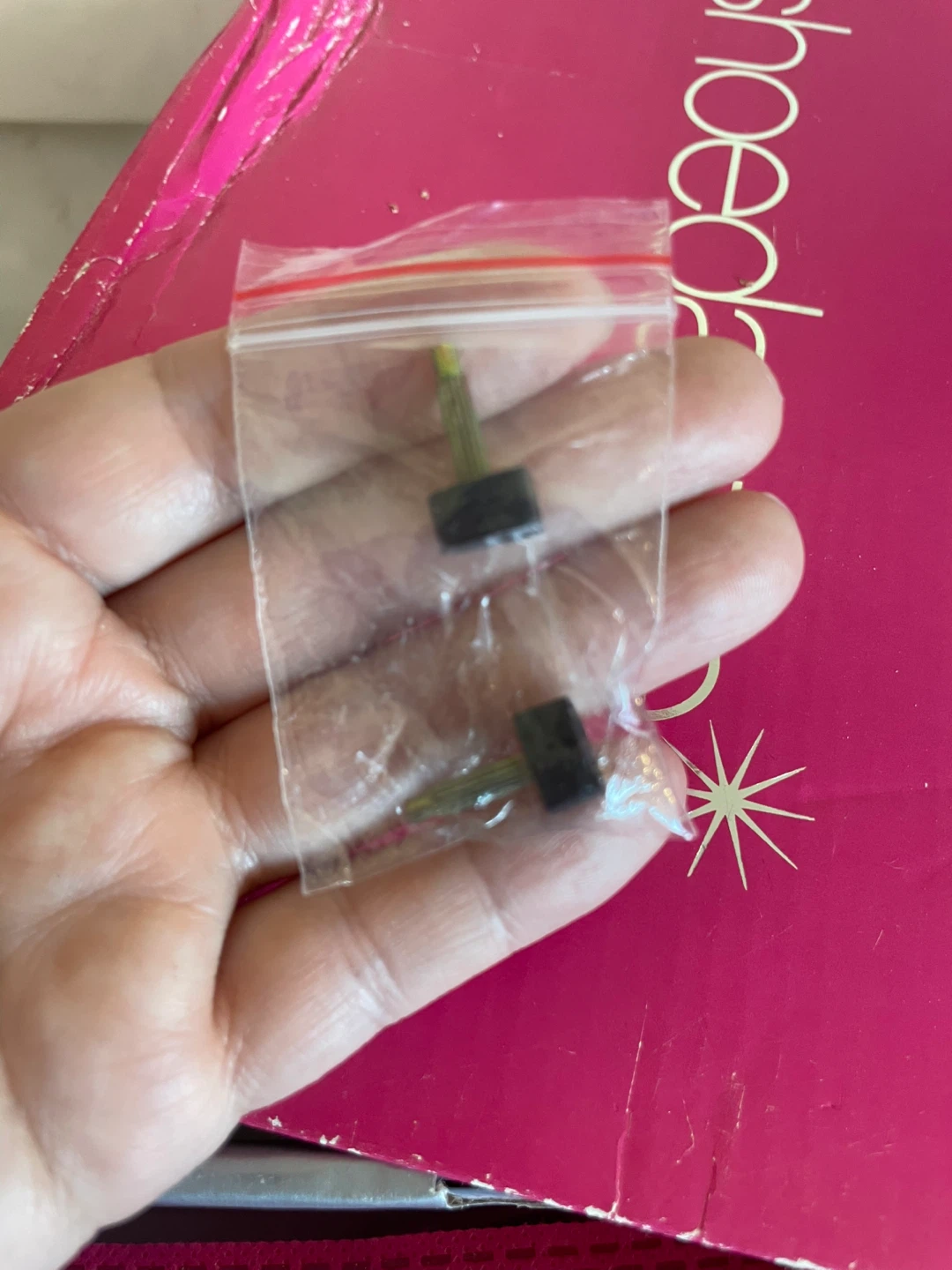 They have never been worn but they do have a few spots inside the shoe peeling. They have been sitting in the box too long without any use. Comes with a bag. Also comes with some extra pieces for the bottom of the heels.