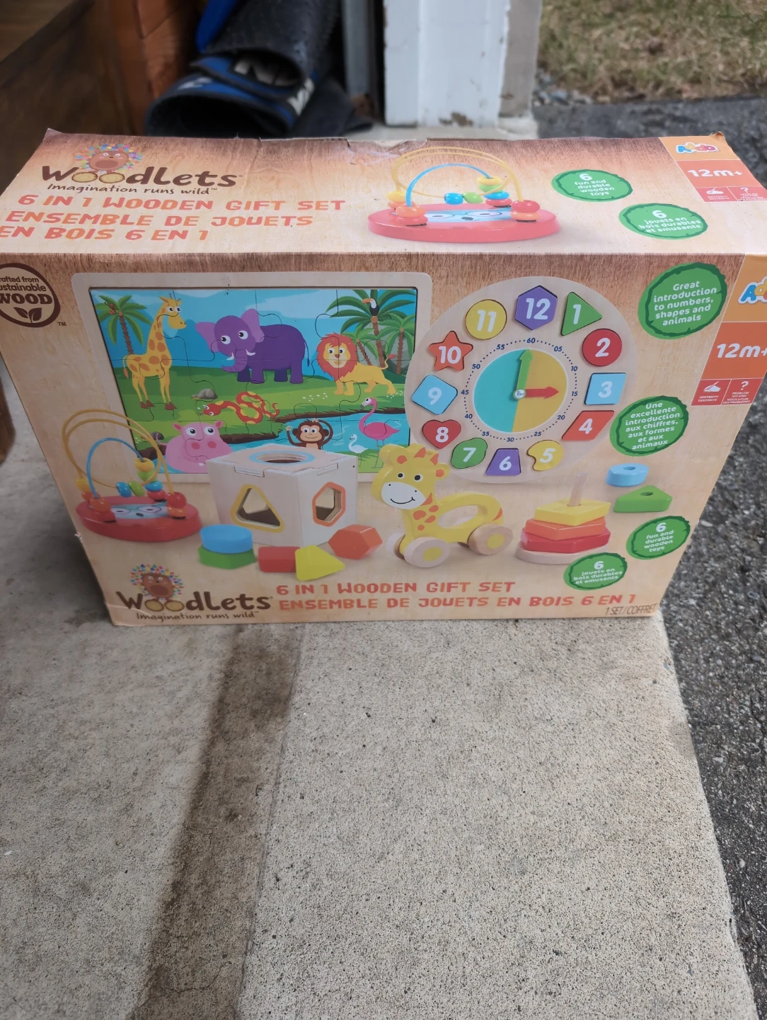 This Woodlets 6-in-1 wooden gift set features durable wooden toys. It's a great introduction to numbers, shapes, and animals for little ones. This set includes a puzzle, a clock, and other engaging activities.