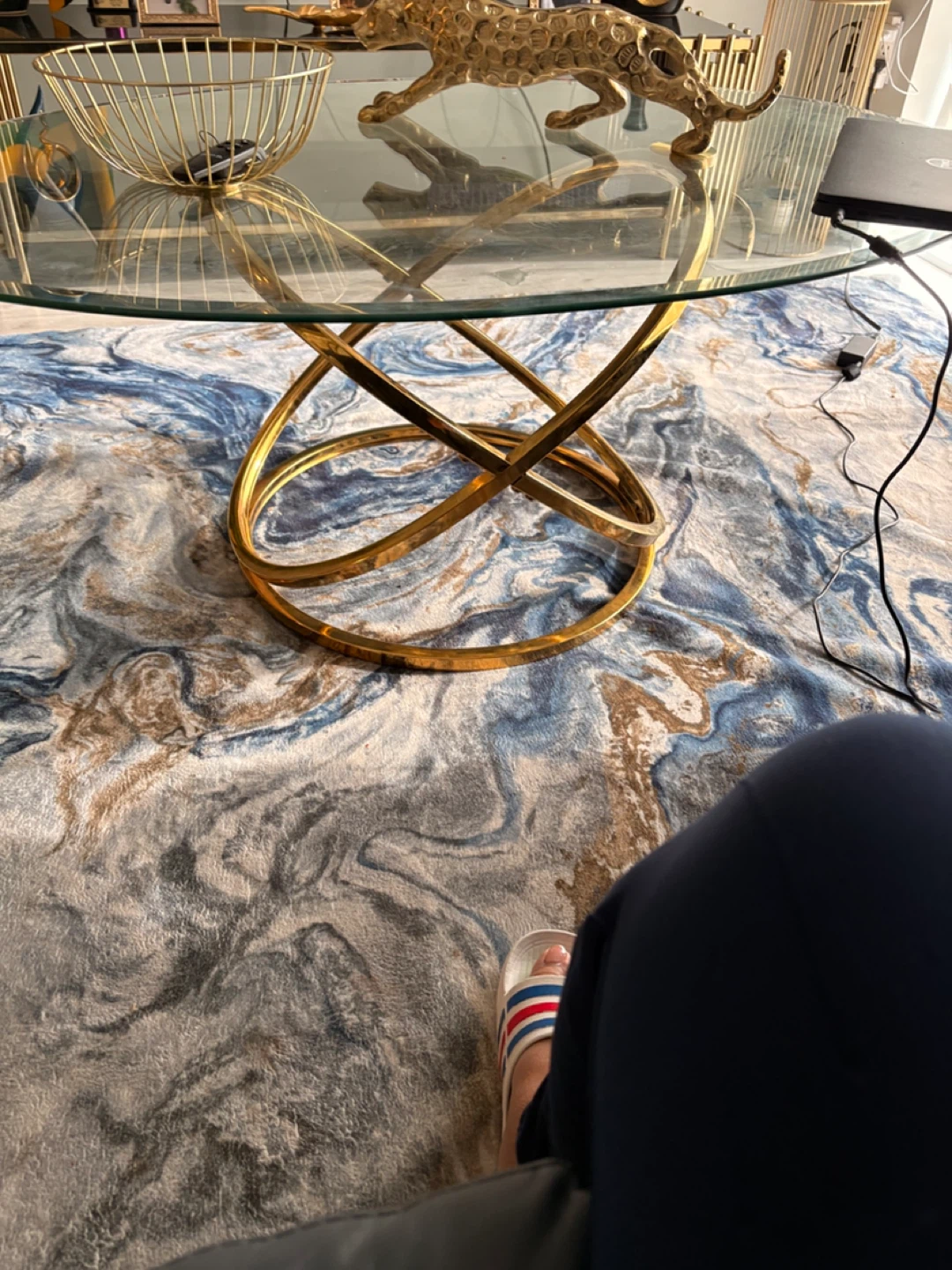 This stylish accent table features a clear glass top and a unique gold metal base with a swirling design. It's a great addition to any living space, offering a touch of modern elegance. The sturdy metal frame provides reliable support for your items. Centre larger piece and side round table