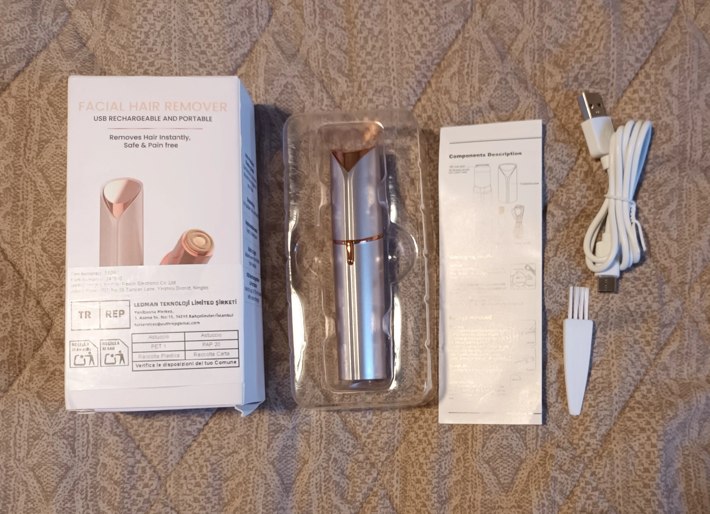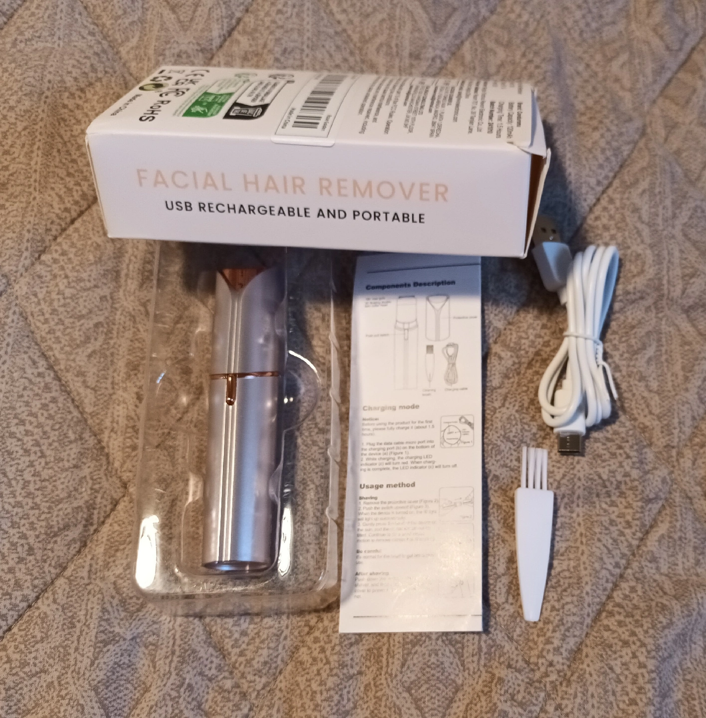 USB rechargeable, portable, and water resistant! It removes hair instantly, safely, and pain-free. You can use it for up to 1 hour with one charge