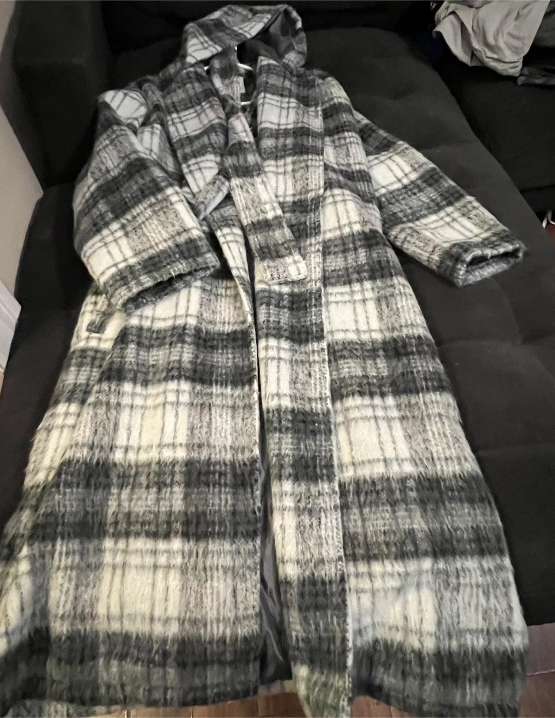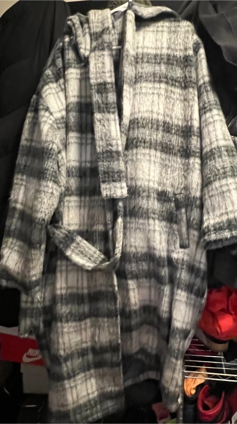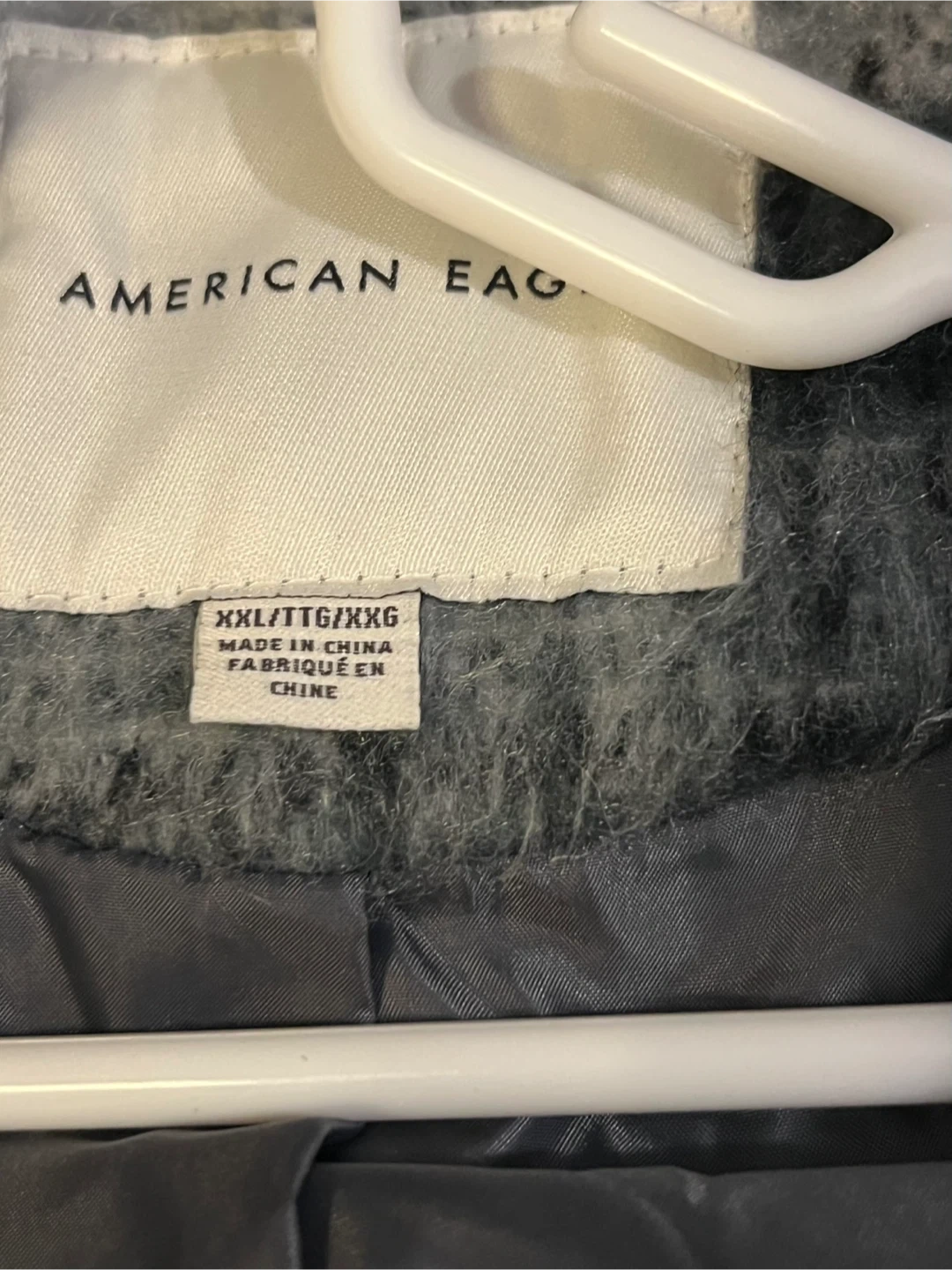Selling a cozy American Eagle hooded coat in a grey and white plaid pattern. It's a size XXL and has a tie waist. Perfect for layering!