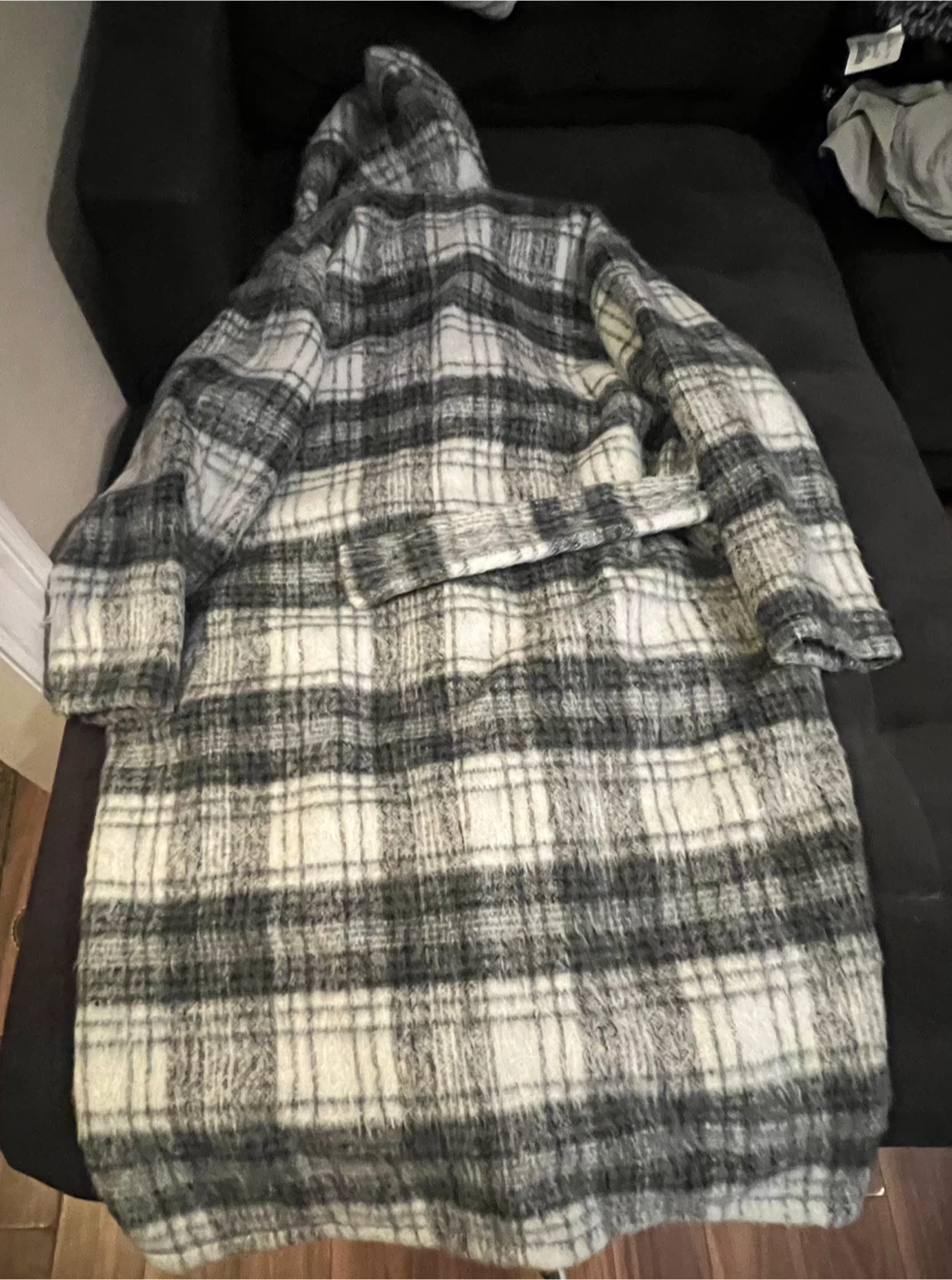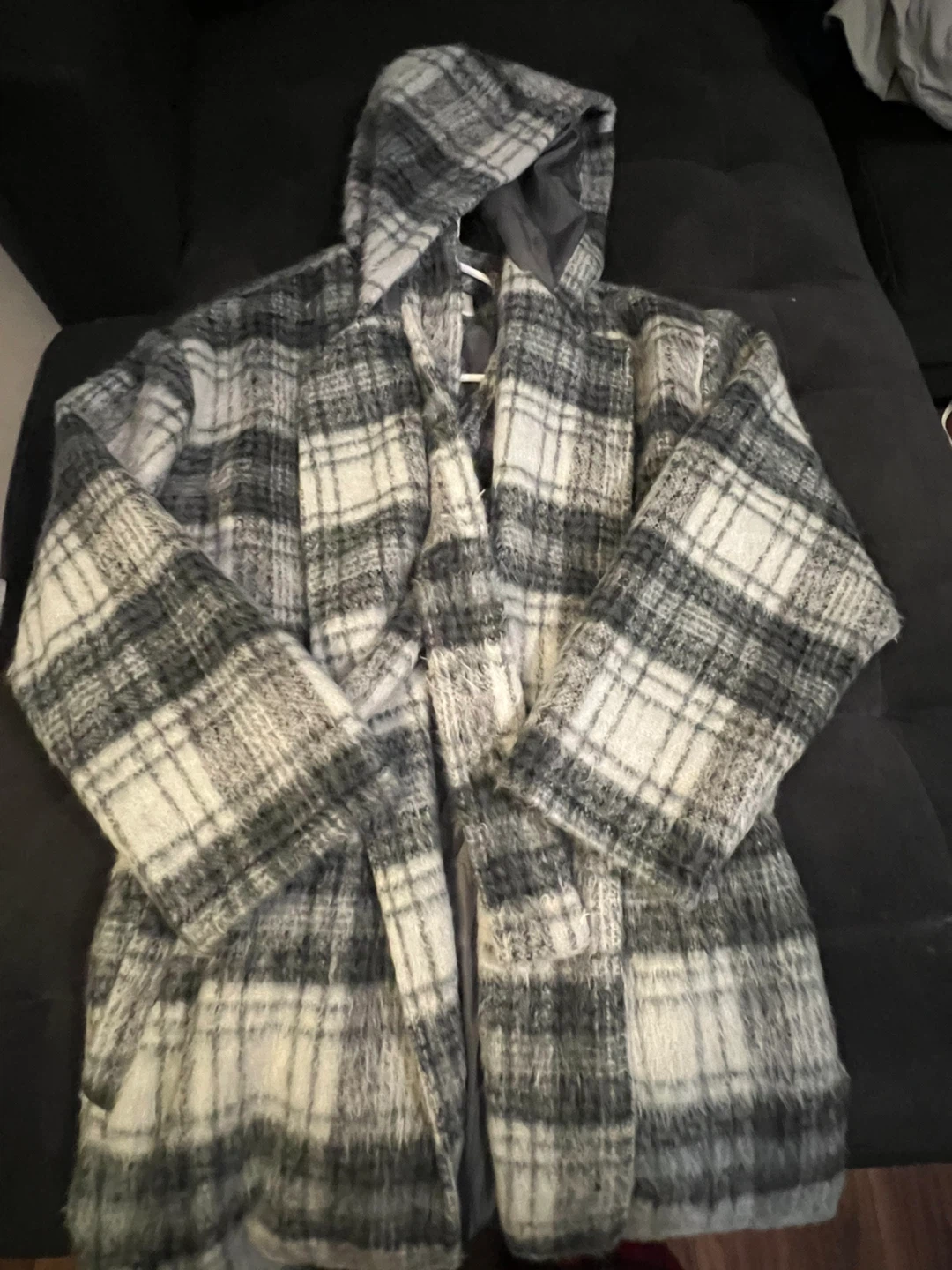 Selling a cozy American Eagle hooded coat in a grey and white plaid pattern. It's a size XXL and has a tie waist. Perfect for layering!