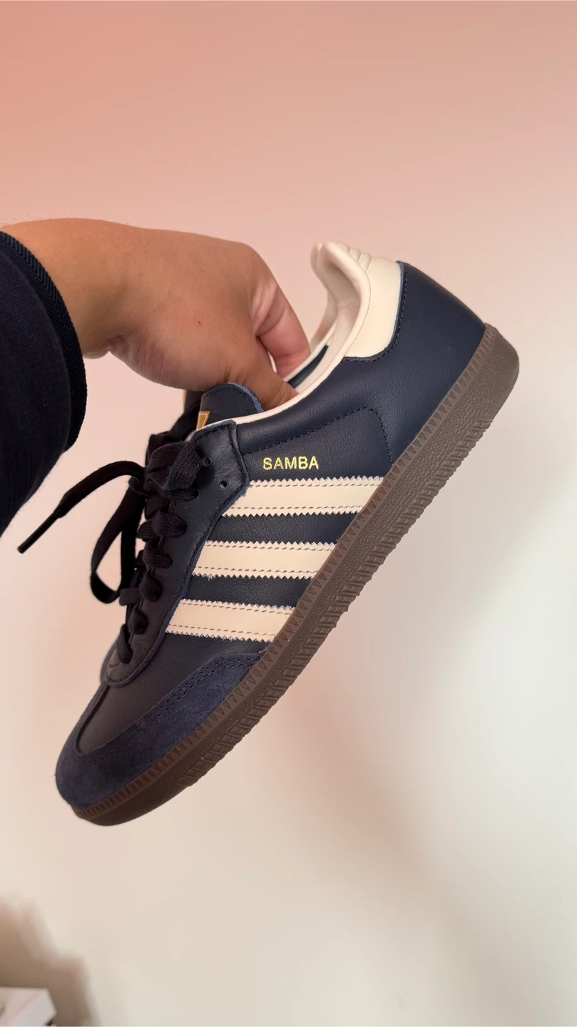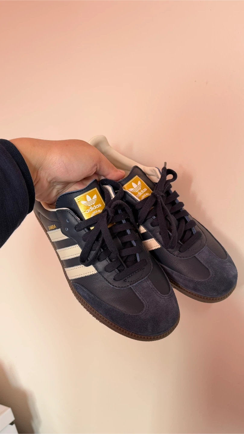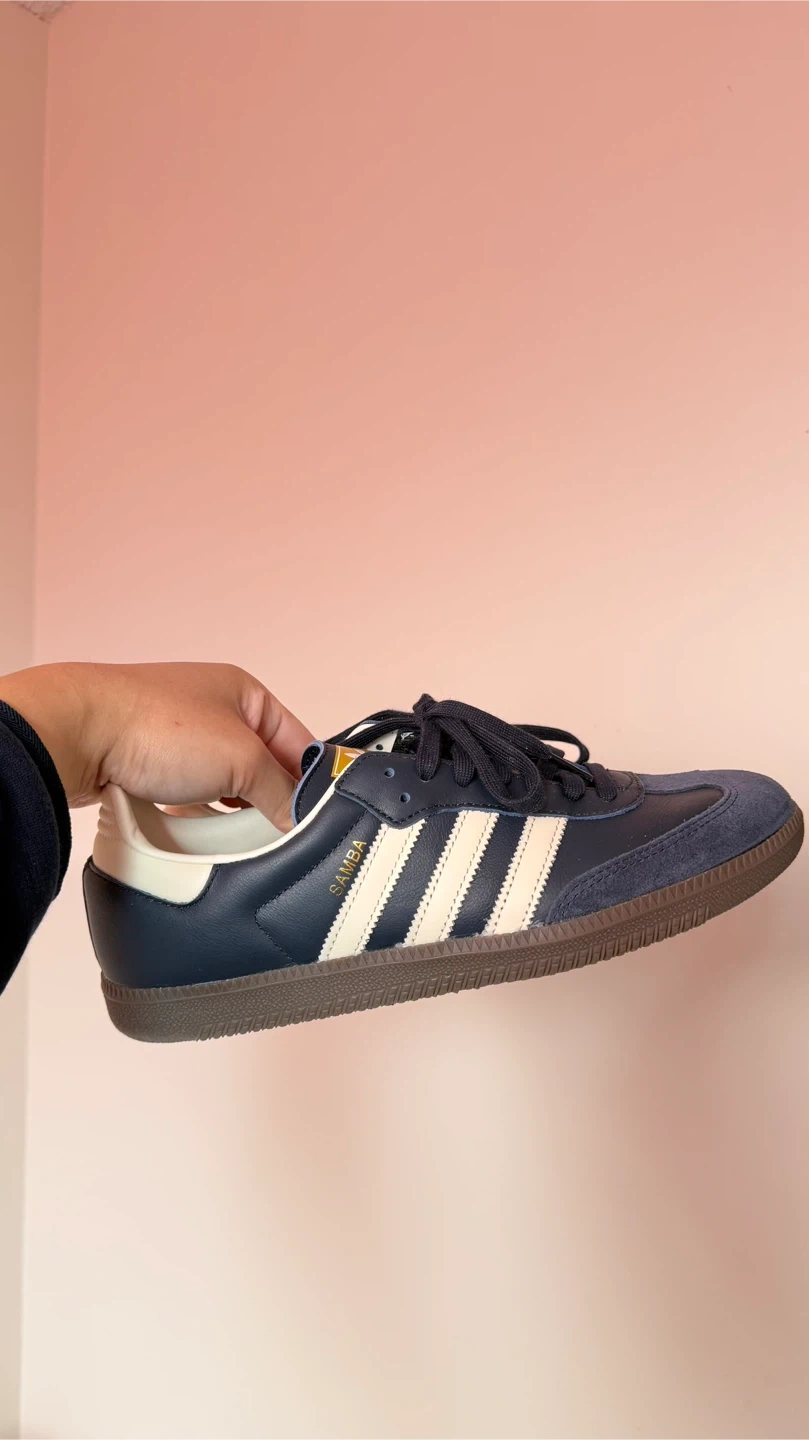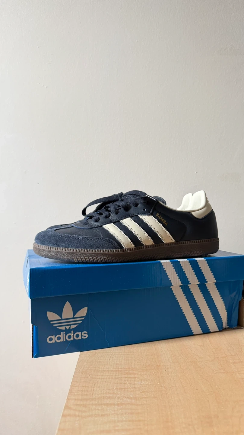 Selling a pair of Adidas Samba shoes in navy blue! They are in great condition and come with the original box. These classic sneakers are super stylish and comfortable, perfect for everyday wear.