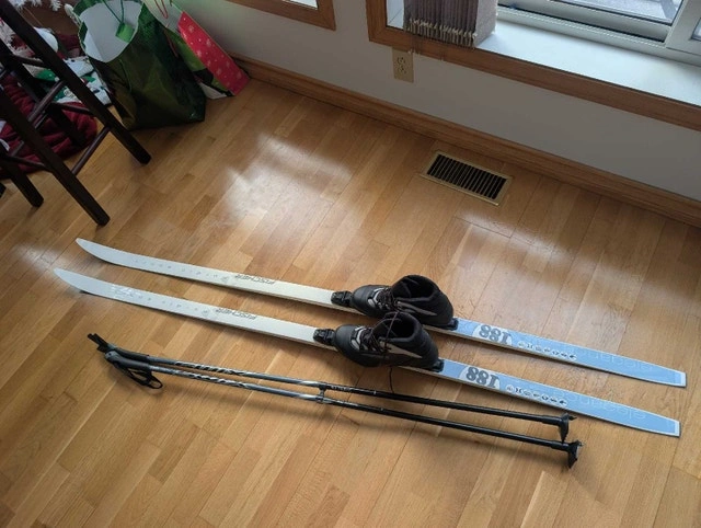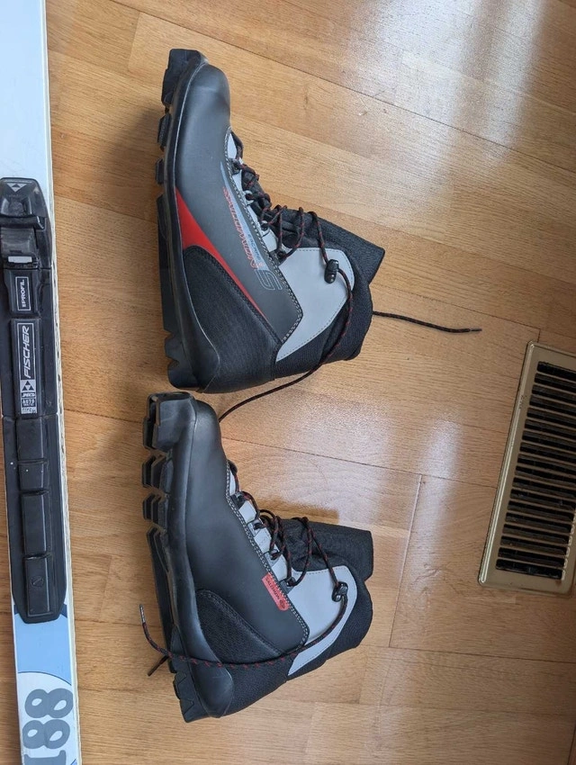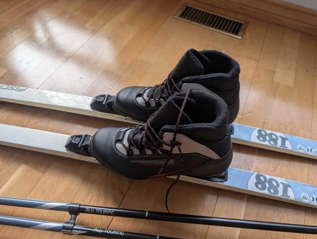 Men's waxless cross country ski package. Includes Fischer Nordic Sport 188cm Fibre Crown elegance waxless skis with Fischer automatic Flex 105 Profil bindings. Skis are in good used condition. Includes Salomon Escape 5 US men's 9.5 boots in very good condition. Also includes very good condition 135cm Swix Alu Touring poles. $300