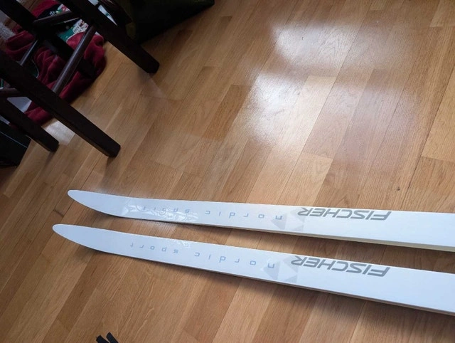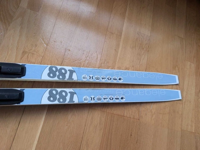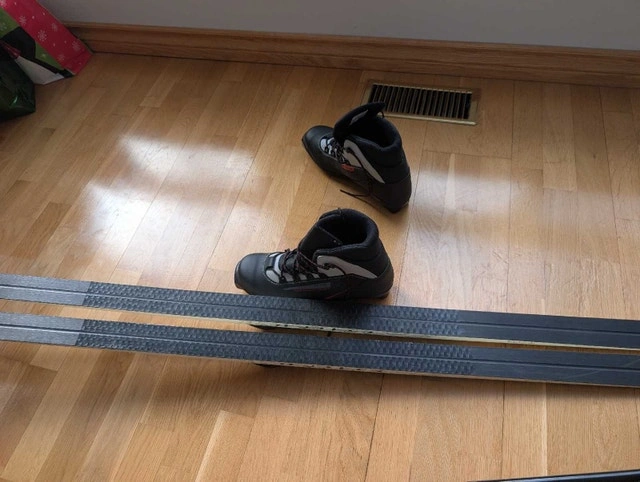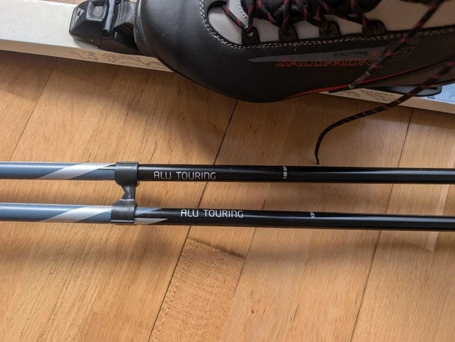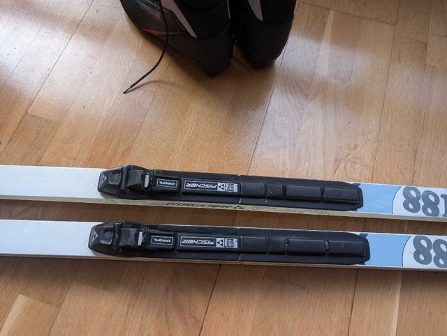 Men's waxless cross country ski package. Includes Fischer Nordic Sport 188cm Fibre Crown elegance waxless skis with Fischer automatic Flex 105 Profil bindings. Skis are in good used condition. Includes Salomon Escape 5 US men's 9.5 boots in very good condition. Also includes very good condition 135cm Swix Alu Touring poles. $300