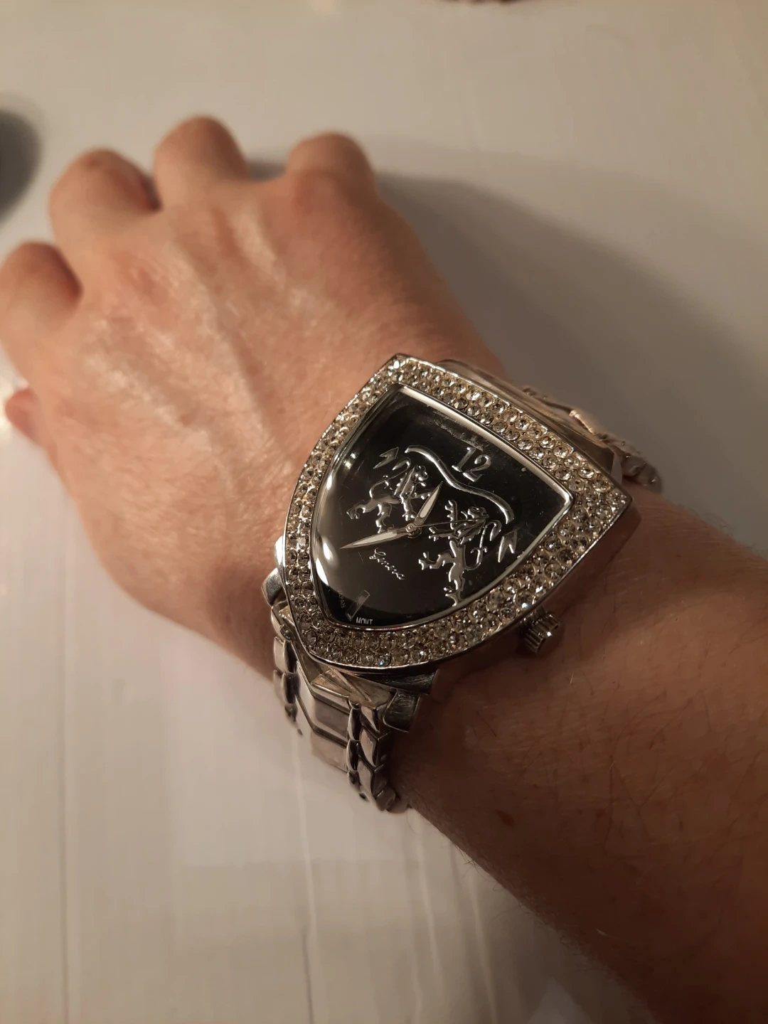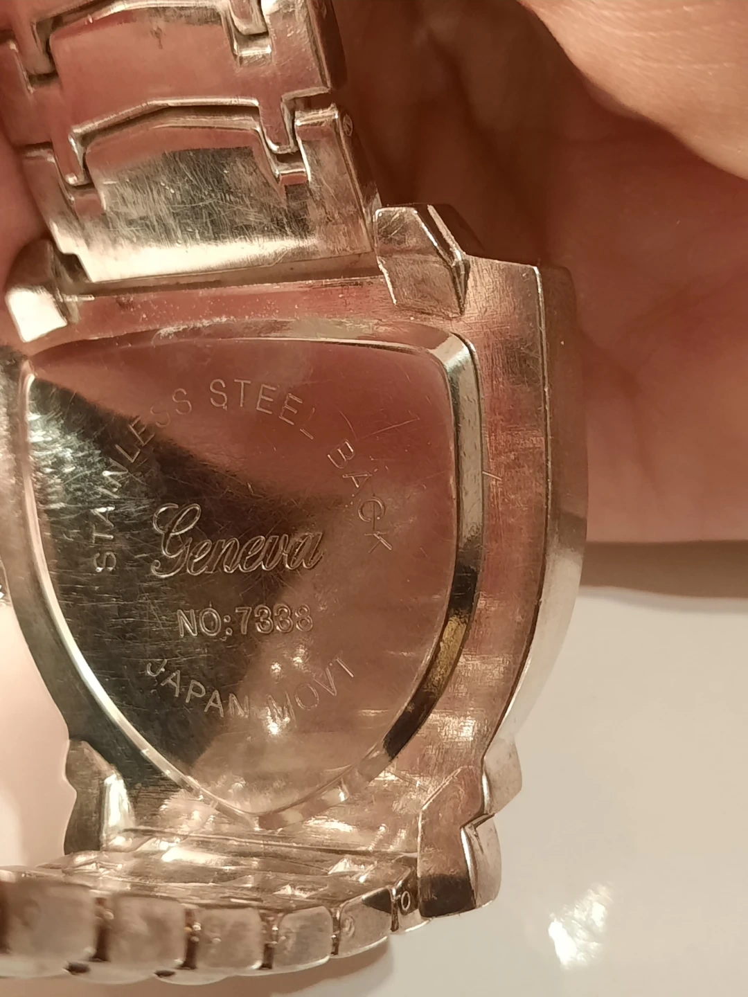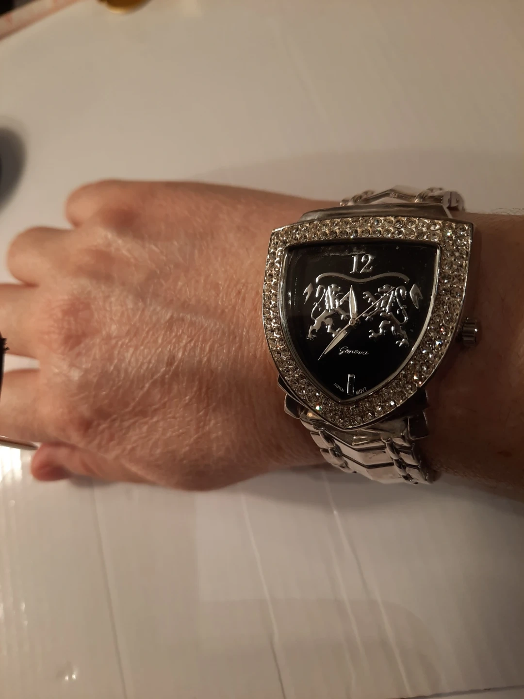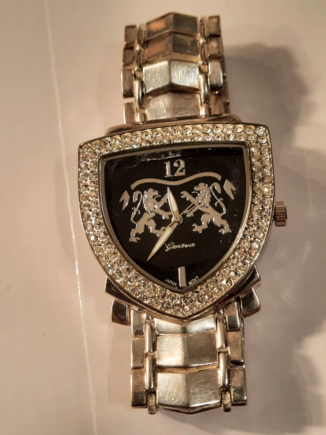 This is a Geneva shield-shaped watch with a crystal-embellished bezel. It has a metal band and a black dial featuring two lions and the Geneva name. The case back is stainless steel and it's a Japan Movt.