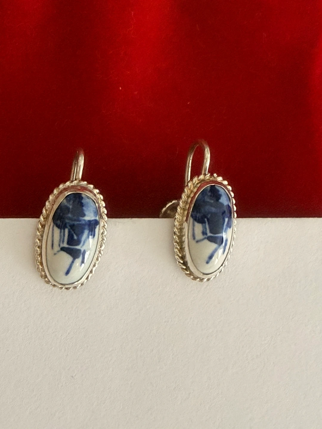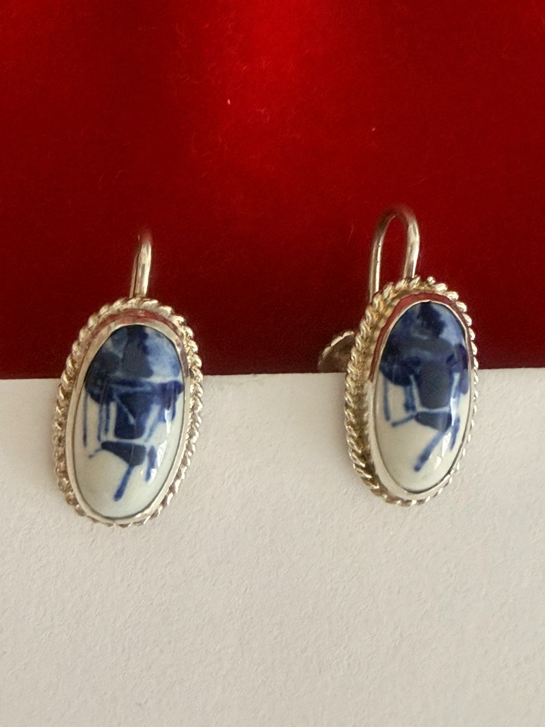 Vintage Delft Blue & 925 Sterling Silver Windmill Earrings
