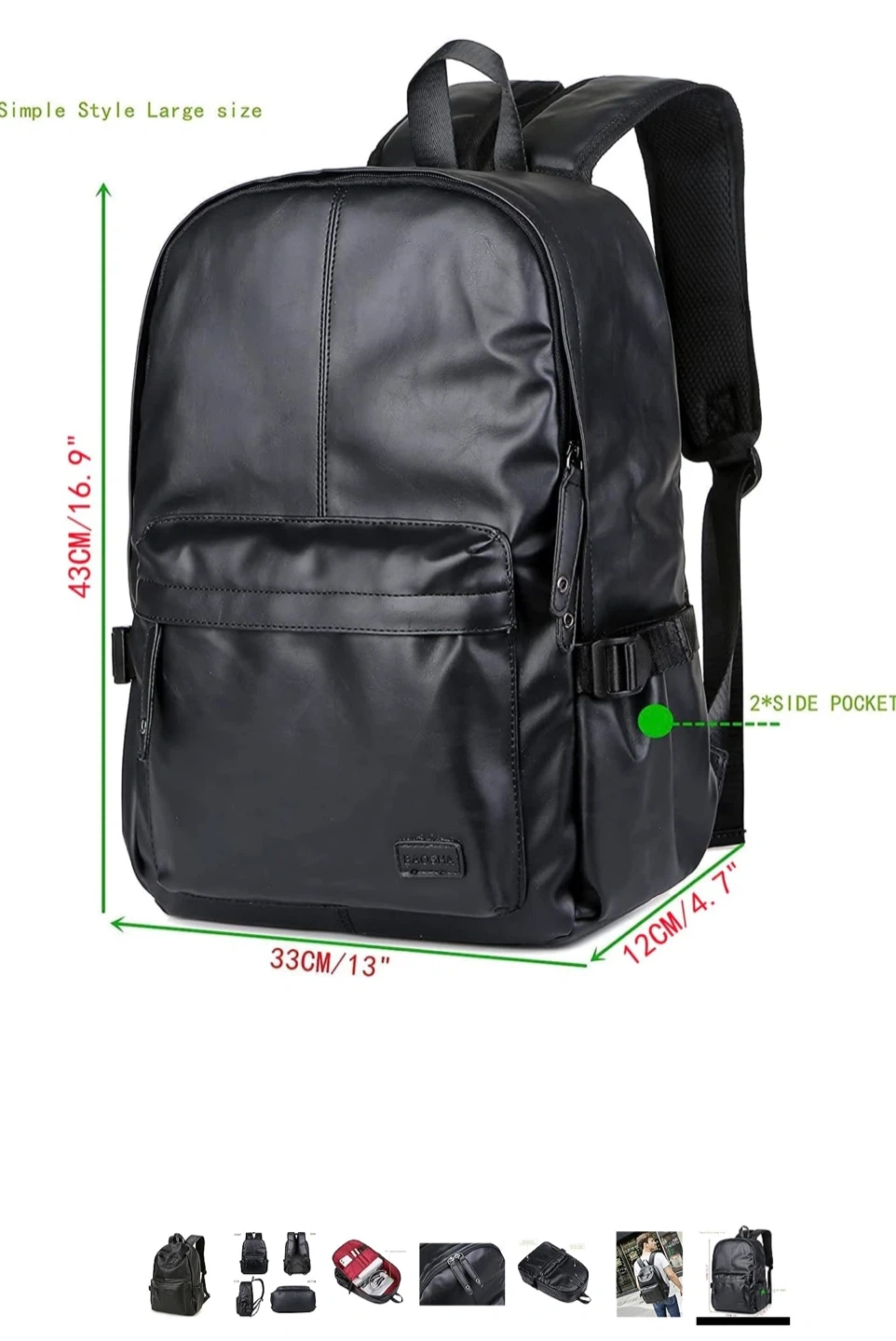 This BAOSHA backpack is made from black PU leather. It's a large size backpack with a 15.6" laptop compartment and two side pockets. It's great for school or college.