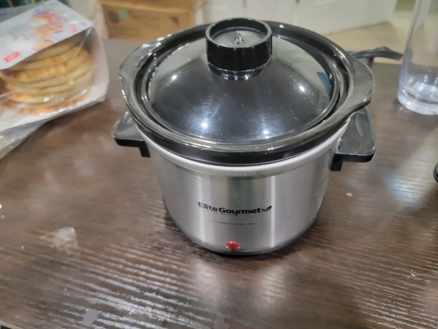 This is an Elite Gourmet slow cooker. It has a removable ceramic pot. Perfect for making single serve warm meals.