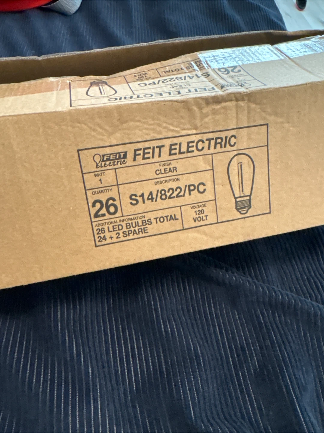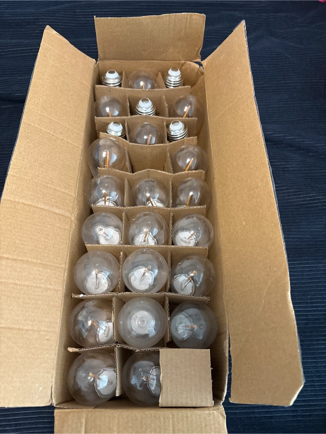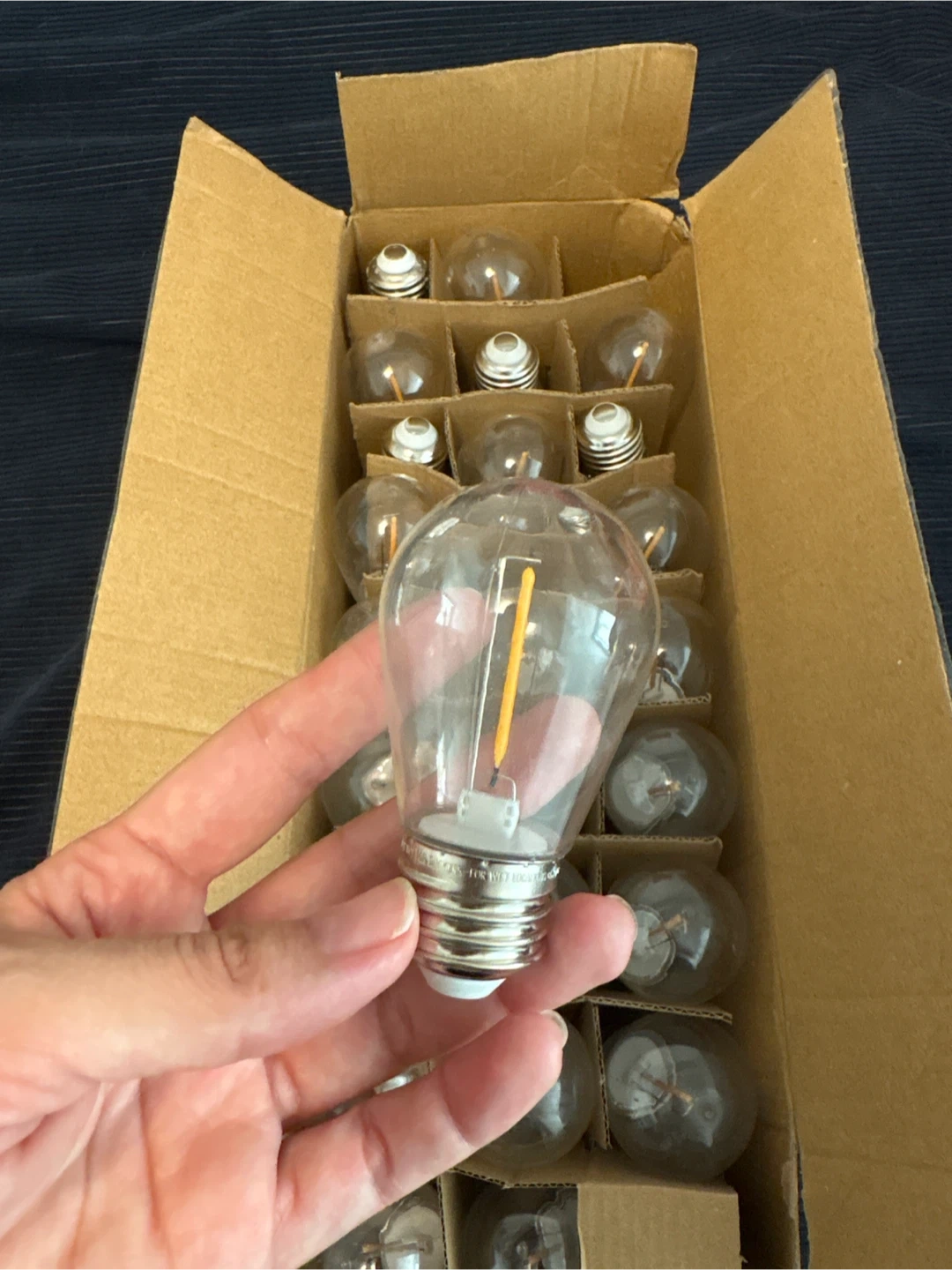 Selling a box of 25 S14 LED light bulbs. These bulbs are clear glass with a warm yellow filament. They're ideal for string lights or decorative fixtures. Standard E26 base.