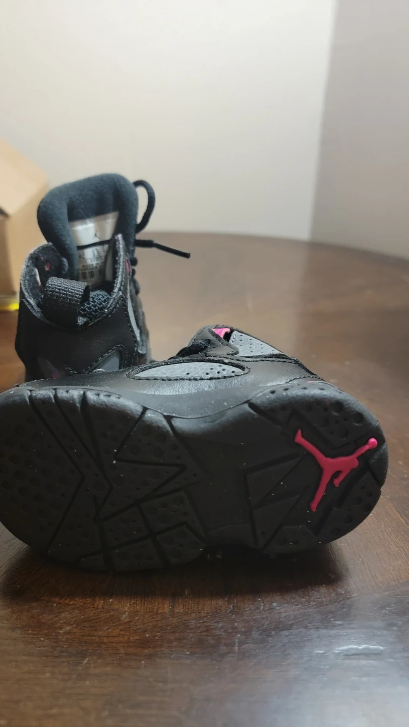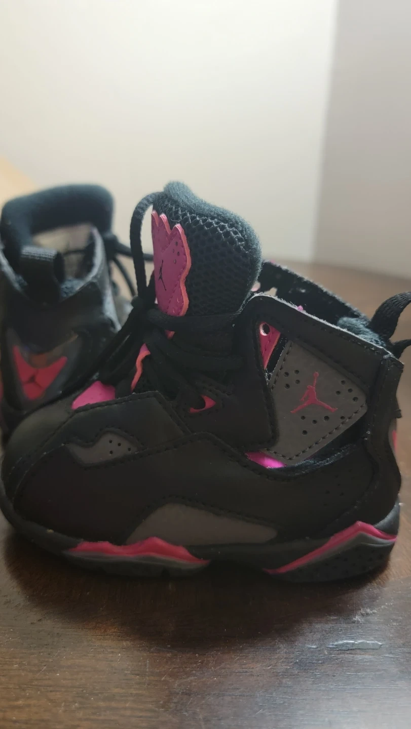 Toddler Jordan crib shoes in black and pink. Lace-up closure for a secure fit. Includes the iconic Jumpman logo. Perfect for little ones starting their sneaker journey!
