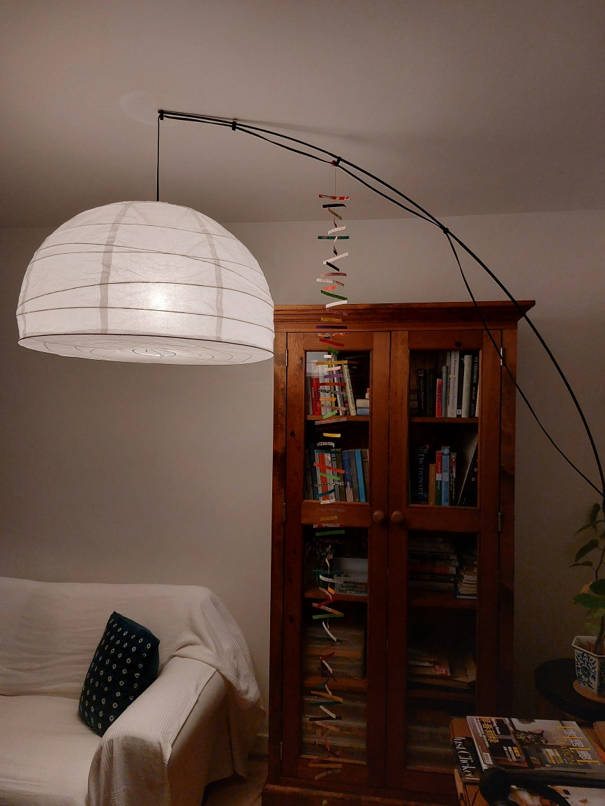 Ikea arc floor lamp with Japanese paper shade. Soft, warm lighting.