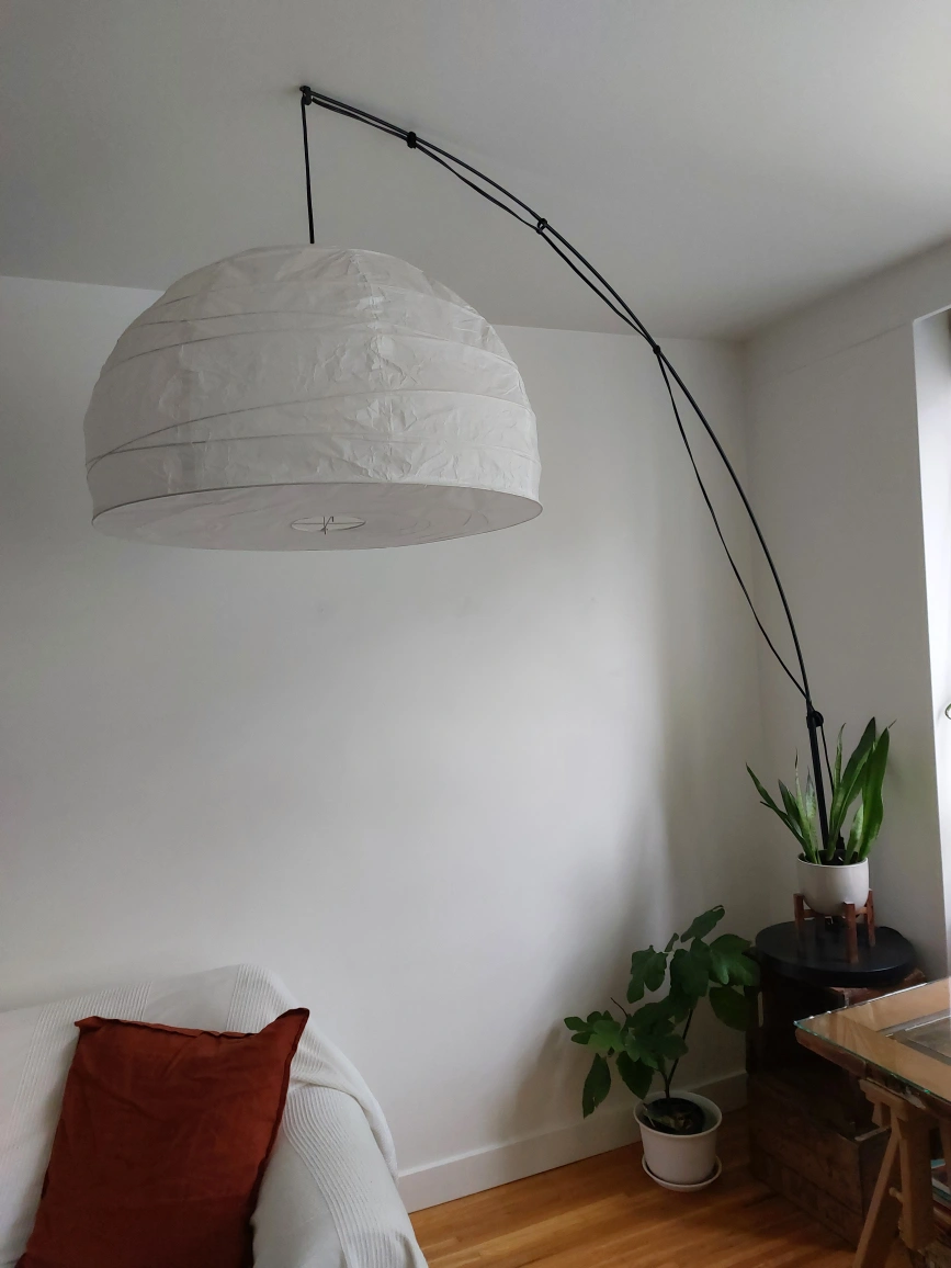Ikea arc floor lamp with Japanese paper shade. Soft, warm lighting.