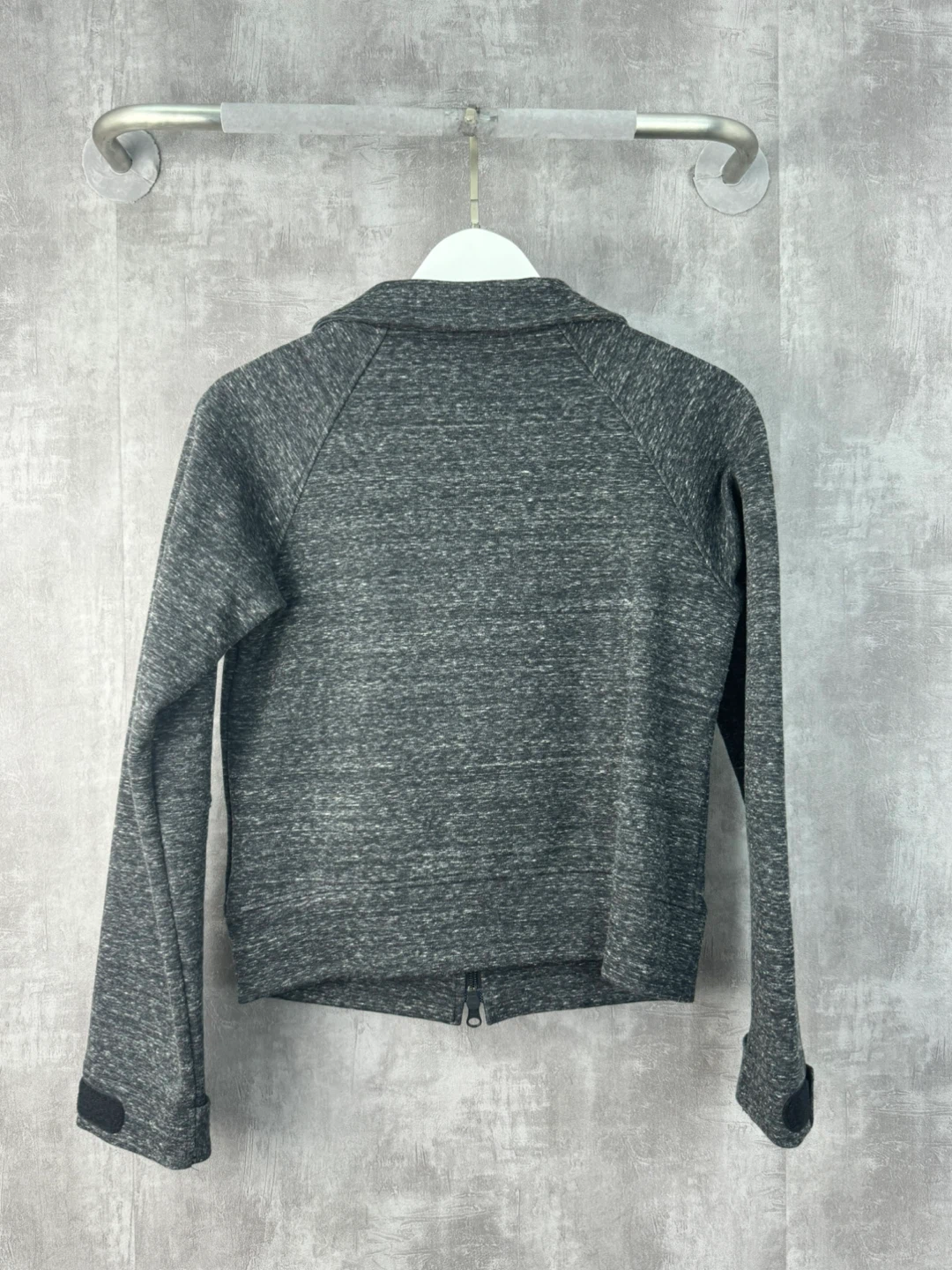 This Y-3 Adidas Yohji Yamamoto jacket is charcoal grey with a textured knit. It features a full zip front and two zippered diagonal pockets. Made from a cotton-polyester blend.
