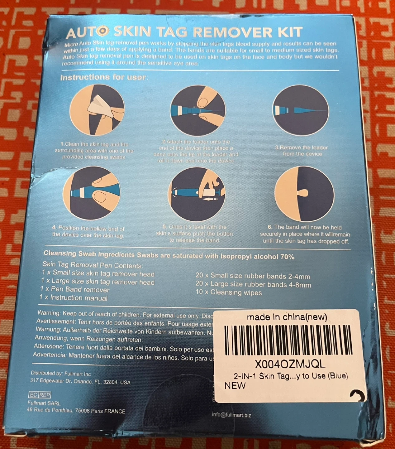 This kit includes 1 auto skin tag remover pen, 10 large size skin tag remover bands, 10 small size skin tag remover bands, 1 pen band remover, and 1 instruction manual. Also included are 20 cleansing wipes saturated with isopropyl alcohol 70%. MFD Date: 2025 May 17. EXP Date: 2030 May 16.