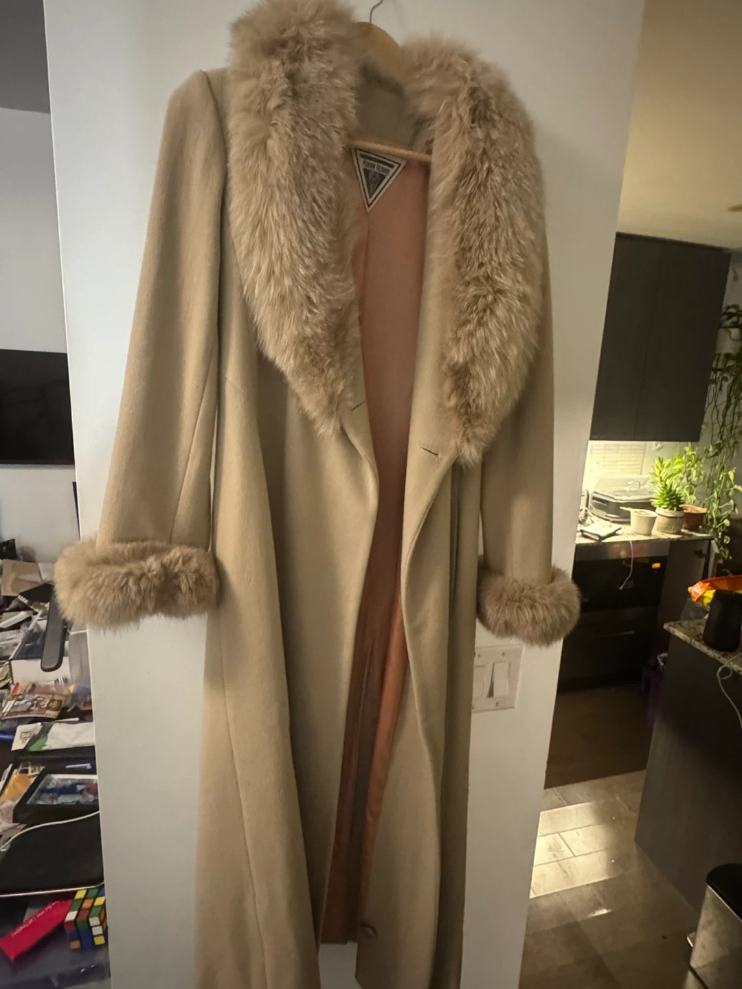 Selling a beautiful wool coat from Marvin Richards! It features a lovely fur trim. There is a small stain on the inside lining and a small tear on the sleeve, as pictured.