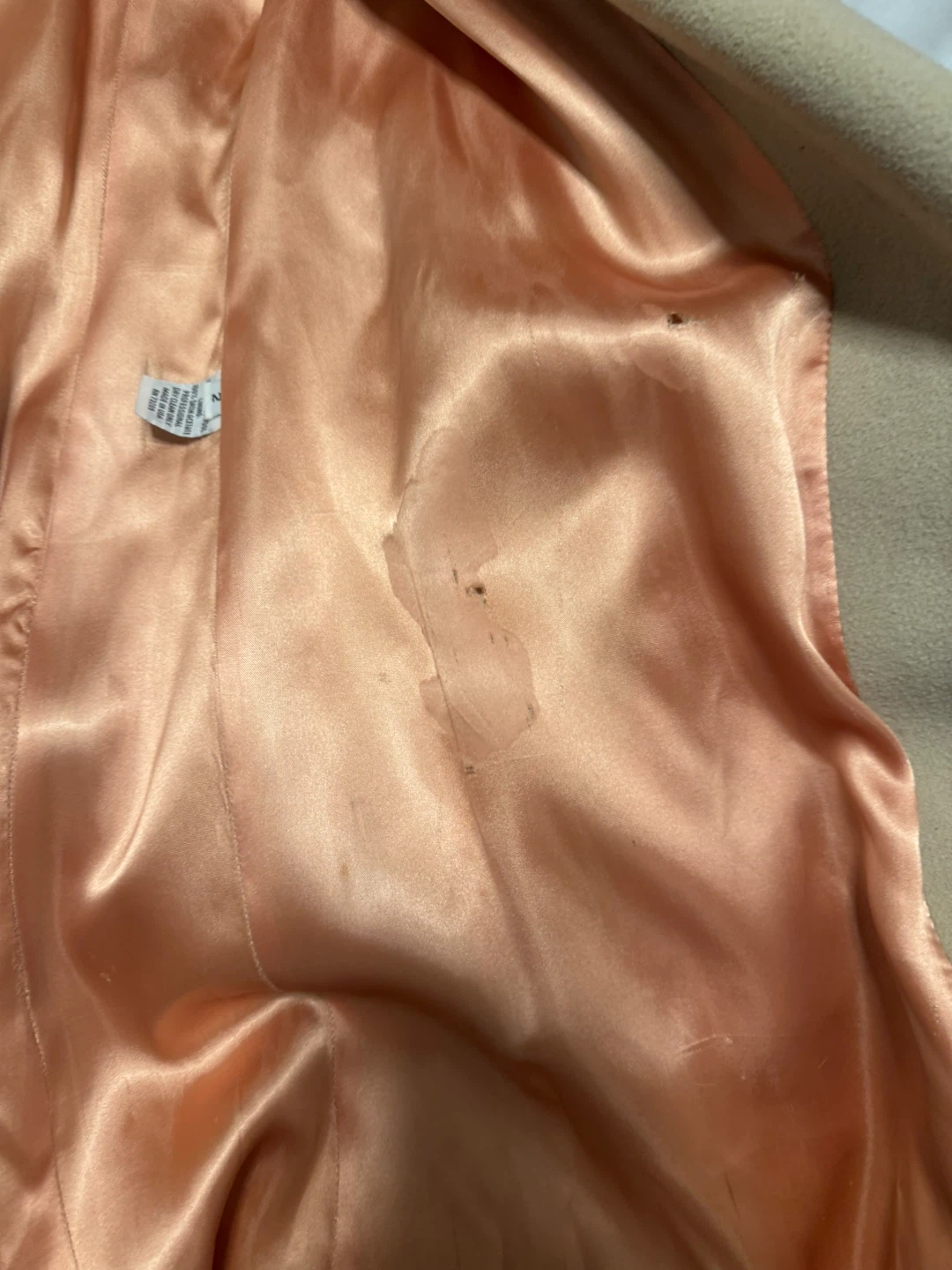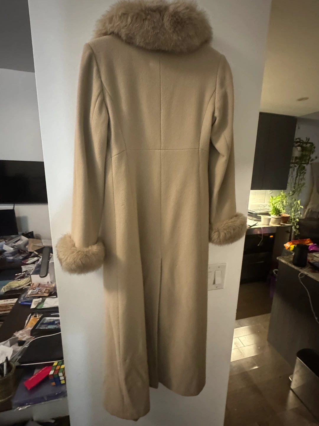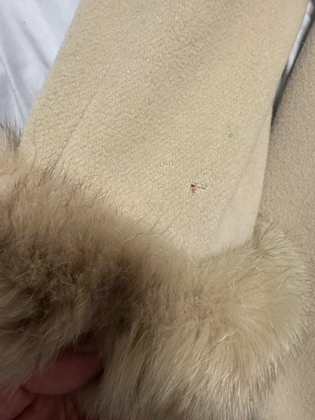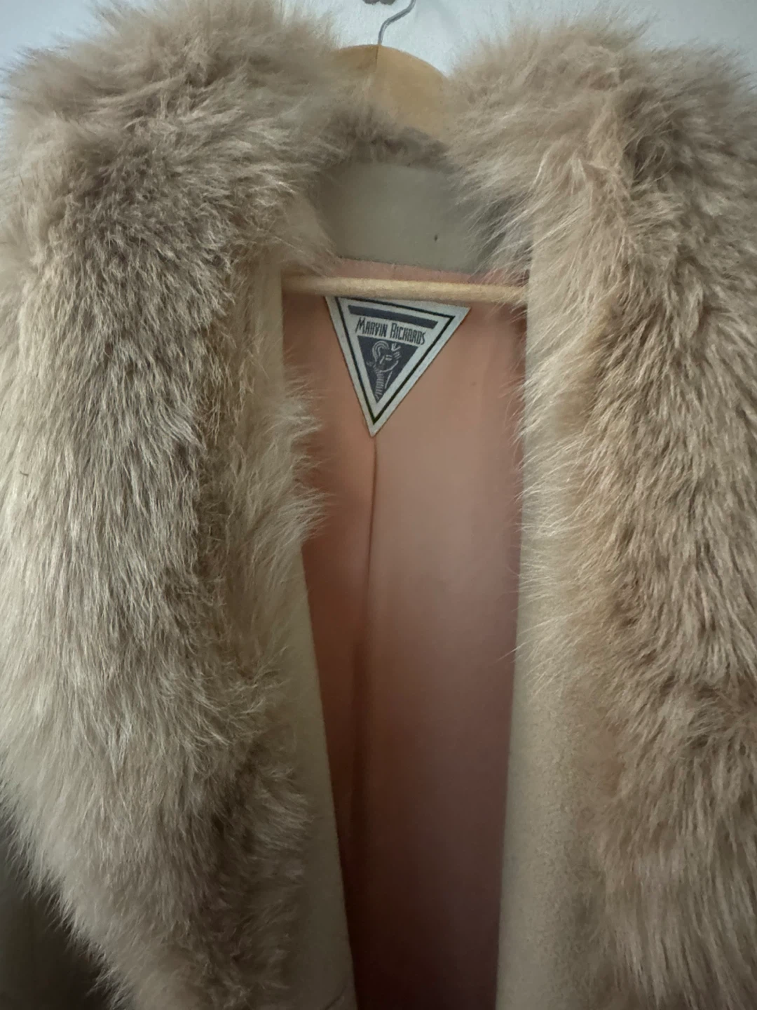 Selling a beautiful wool coat from Marvin Richards! It features a lovely fur trim. There is a small stain on the inside lining and a small tear on the sleeve, as pictured.