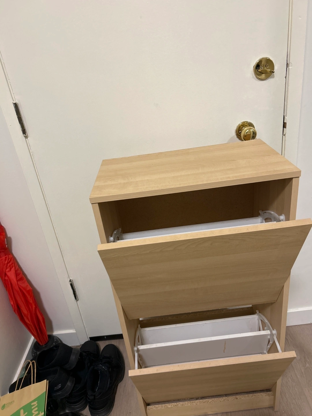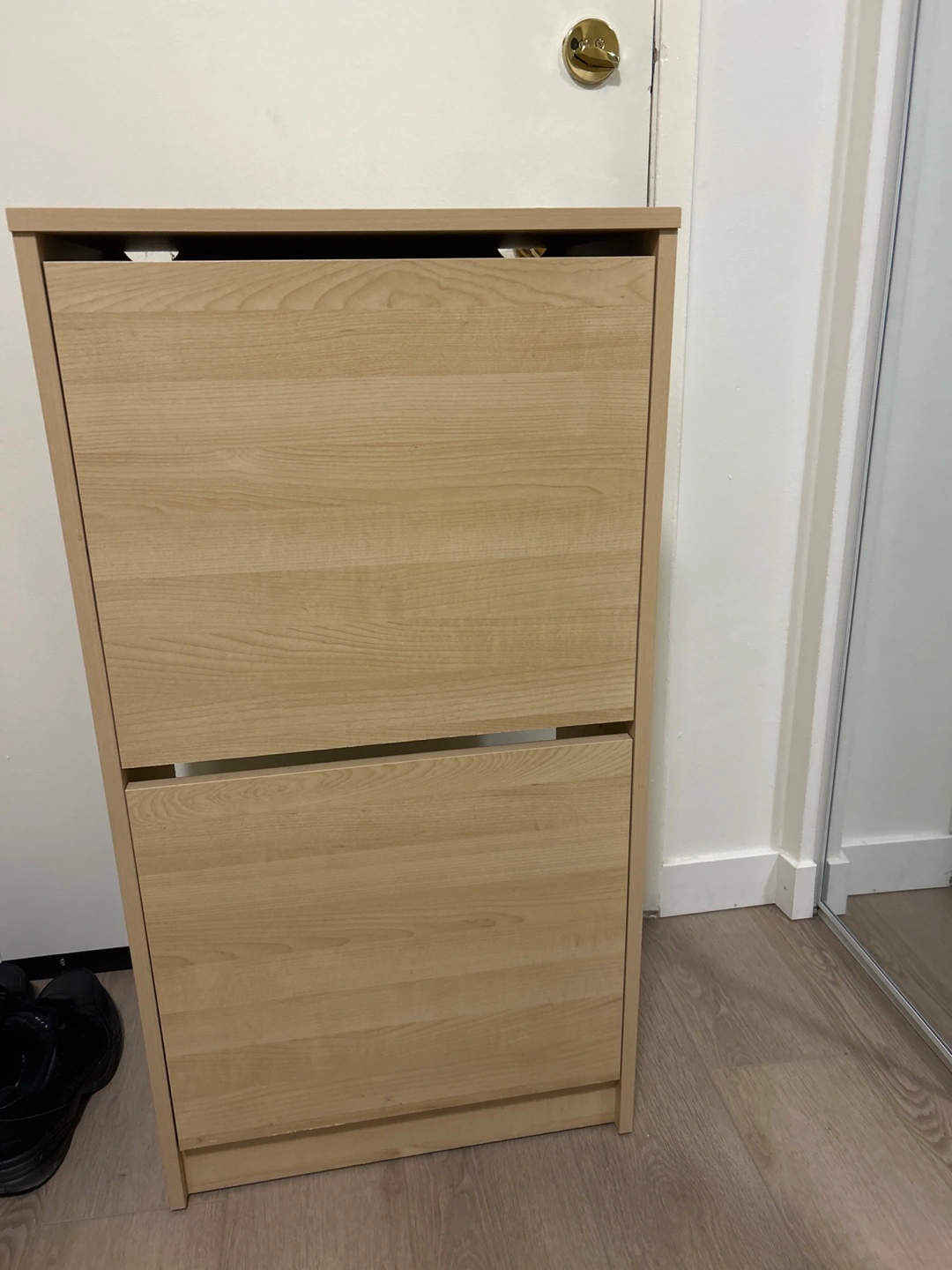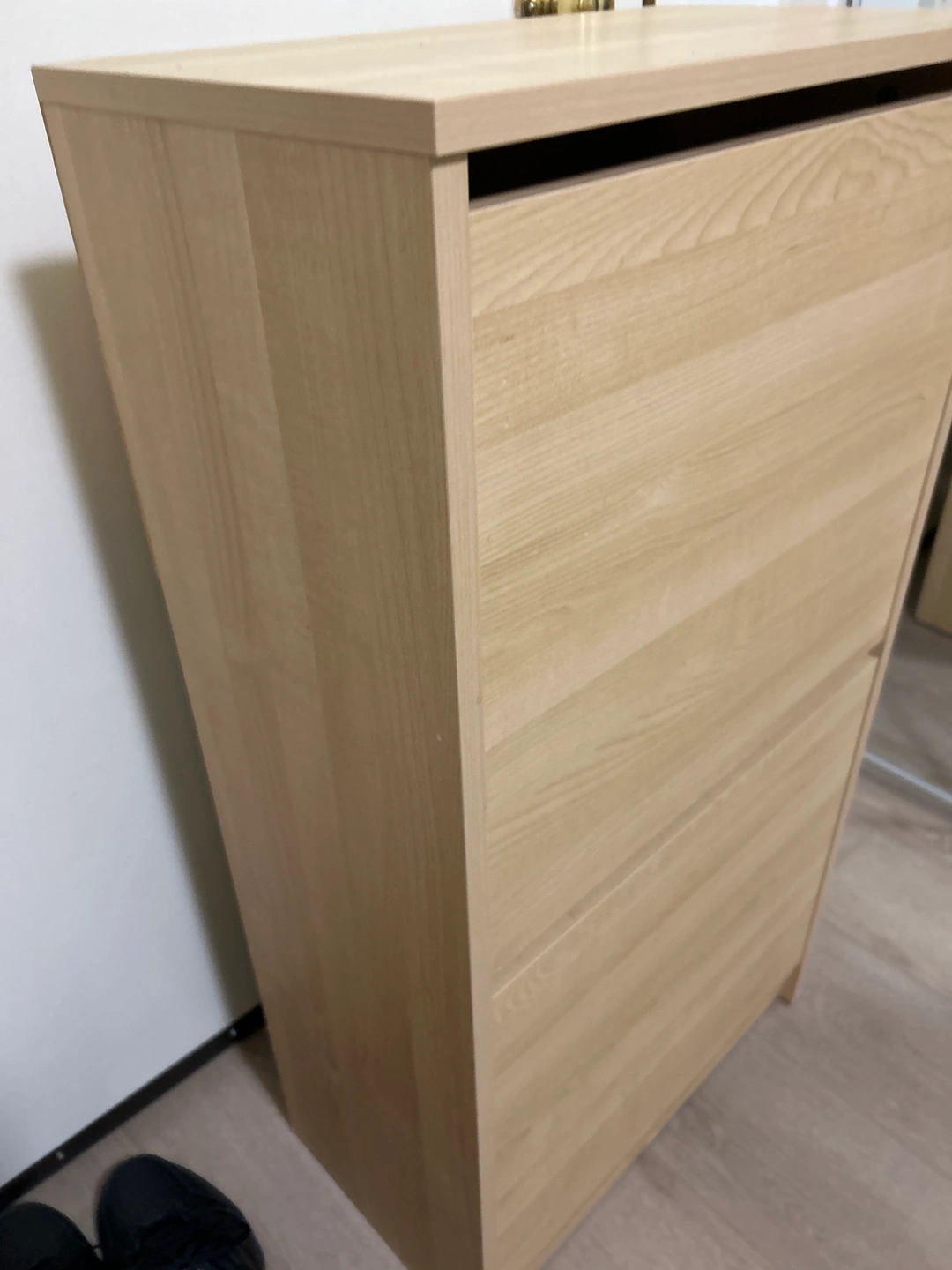 This shoe cabinet has two flip-down compartments for storage. It's made of particleboard with a wood-look finish.
