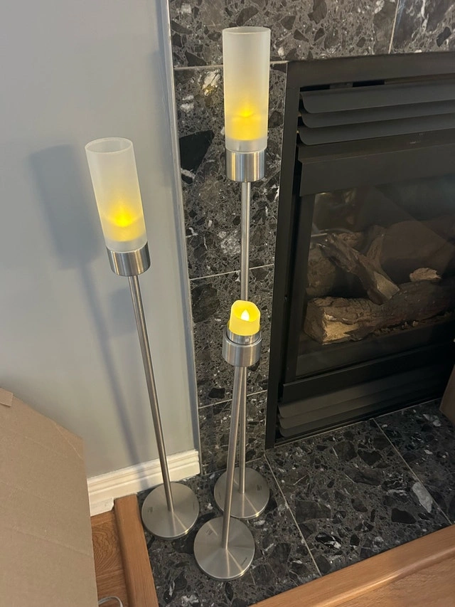 Set of 3 metal candle sticks, candles and batteries included. One glass shade missing. Made in Germany. Remote included, needs new button battery. Pickup in Kanata, Moodie Drive & Queensway. Let me know if you're interested!