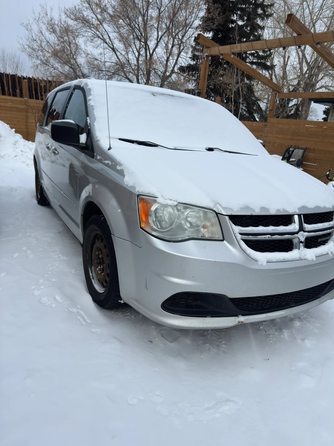 Silver minivan, some rust. Minor exterior damage. Backup camera .