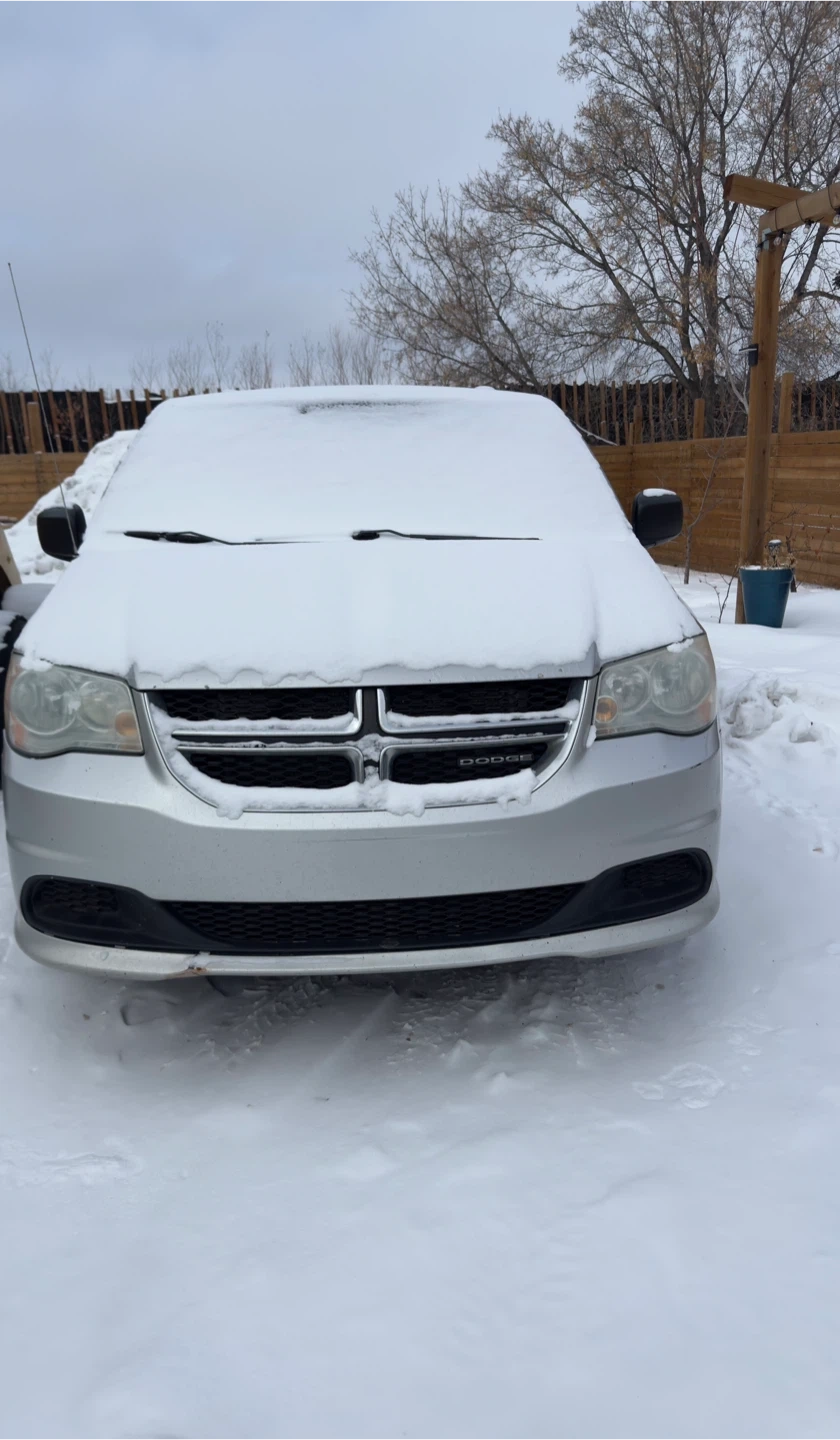 This is a silver Dodge Grand Caravan. It's a minivan suitable for families or transporting larger items. Four doors and plenty of cargo space.