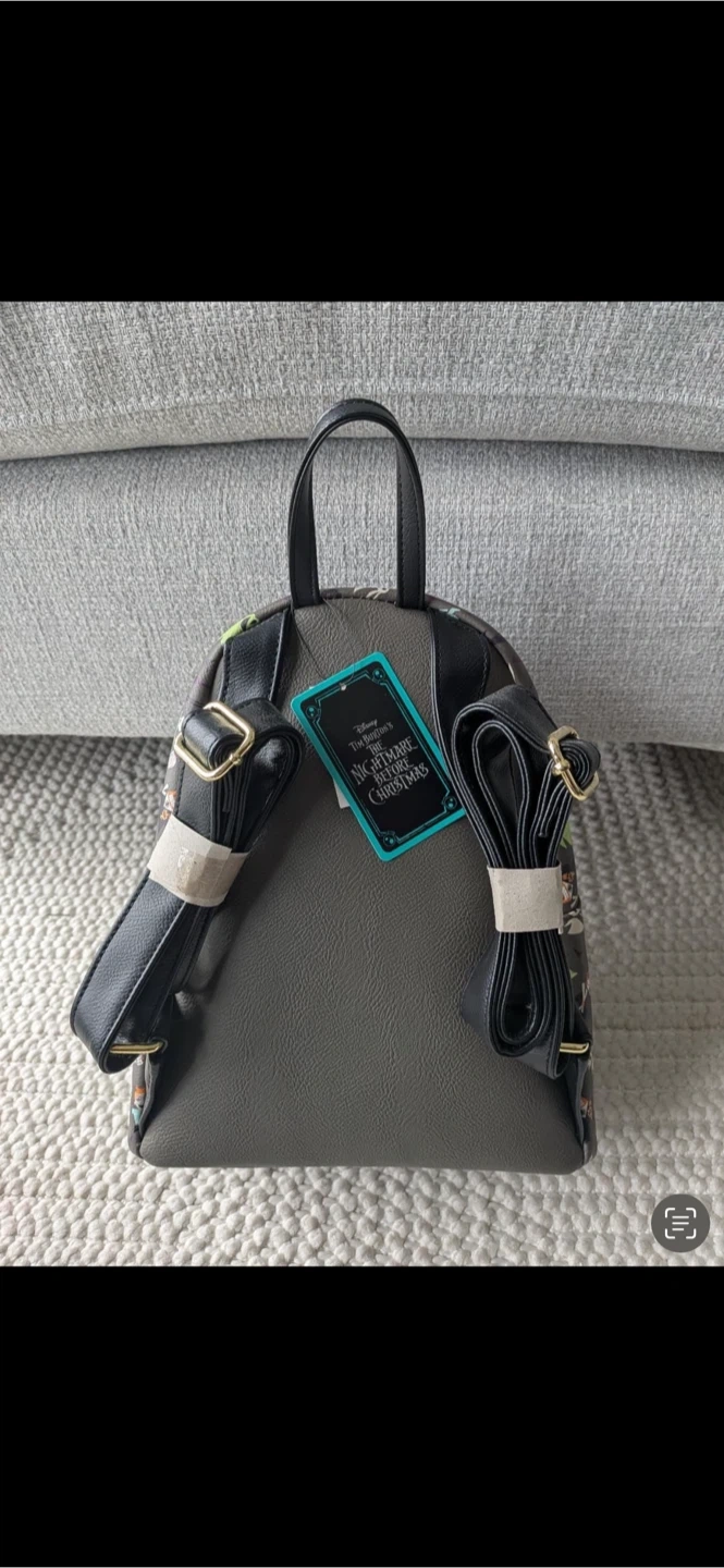 This Loungefly mini backpack features characters from The Nightmare Before Christmas. It has adjustable straps and a zippered front pocket. It's made of faux leather.