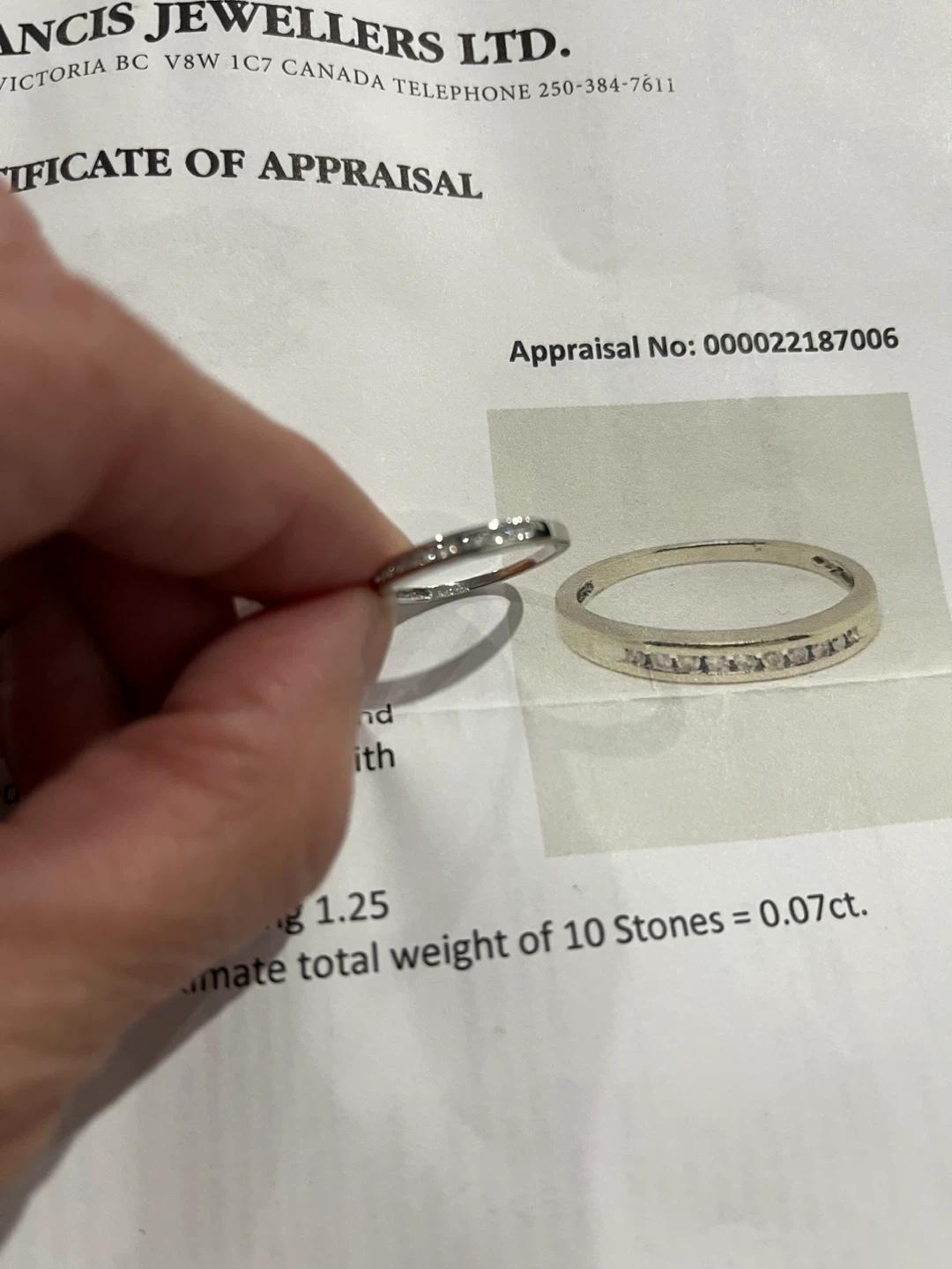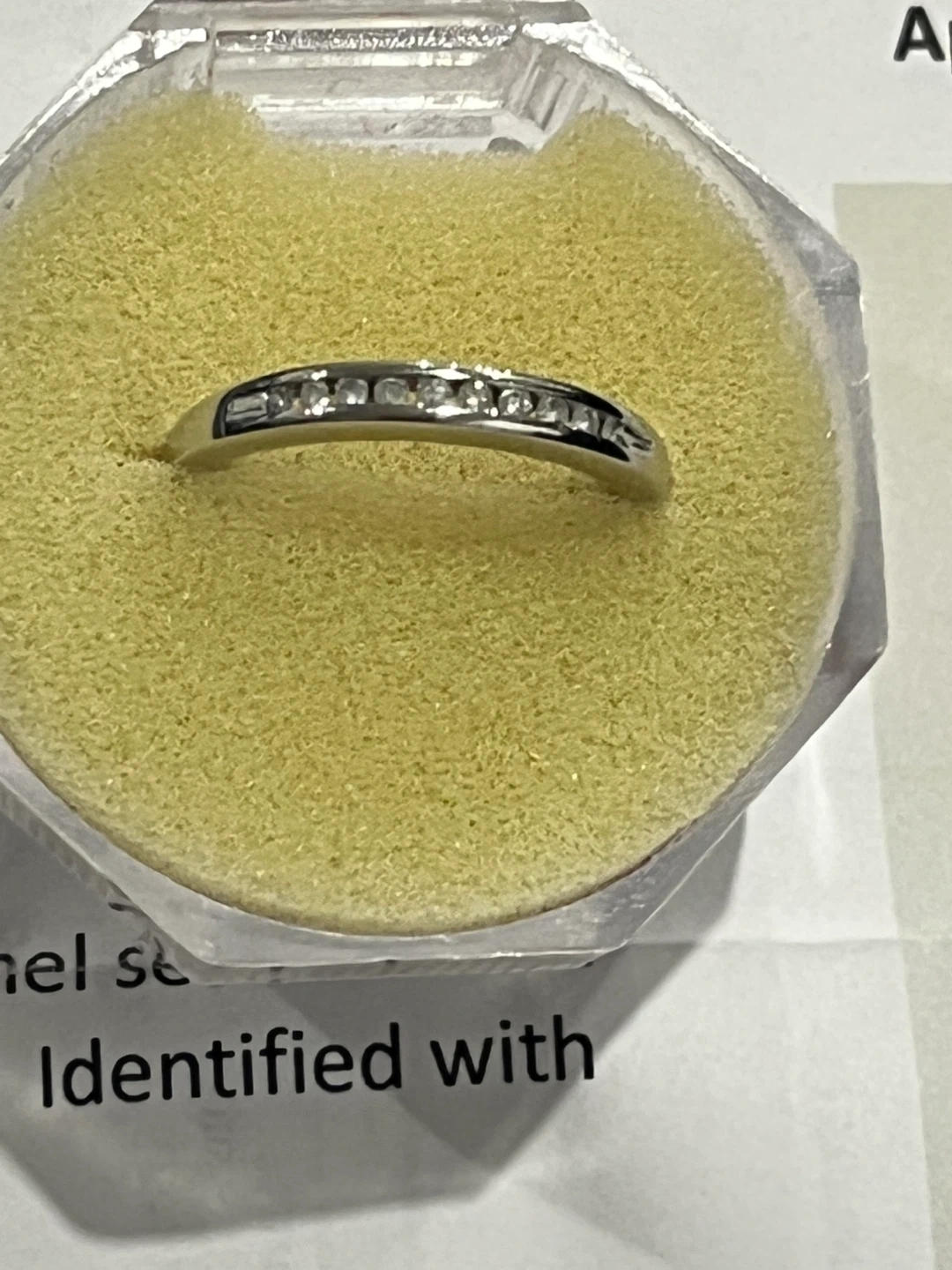 It contains ten channel set round brilliant cut diamonds, measuring 1.25 - 1.20 x 0.74mm (depth est.), 1.00% GTCF approximate total weight of 10 Stones = 0.07ct.