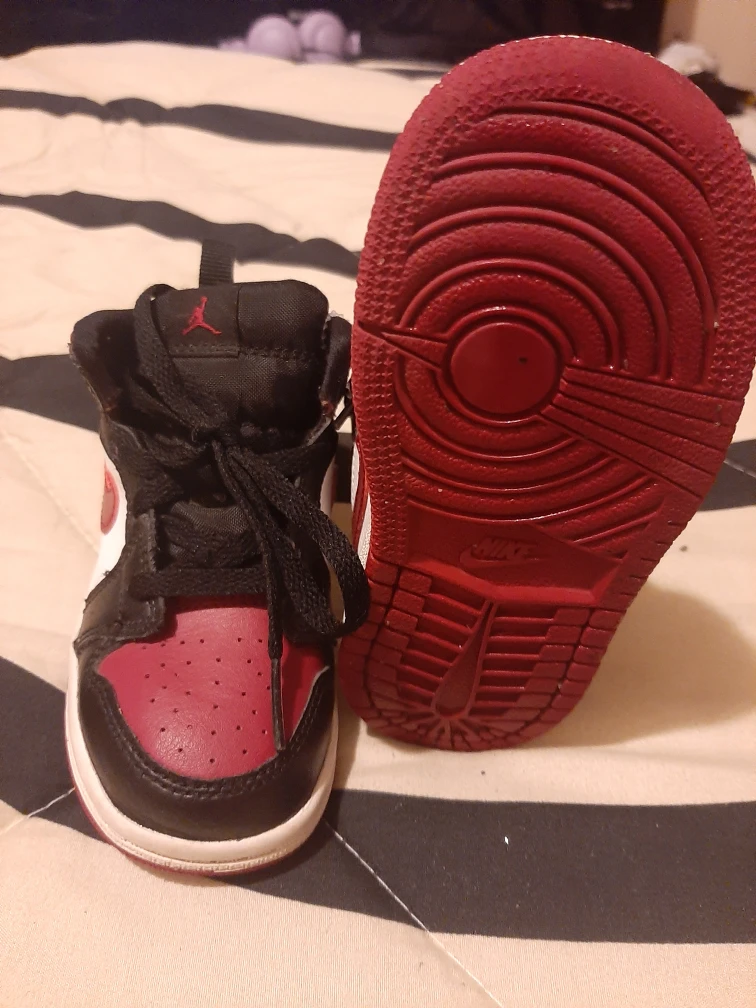 Selling a pair of adorable Nike Air Jordan 1 Crib Booties for babies! They're in great condition and perfect for your little one's first steps. These iconic shoes feature the classic Air Jordan design with a soft and comfortable fit for tiny feet