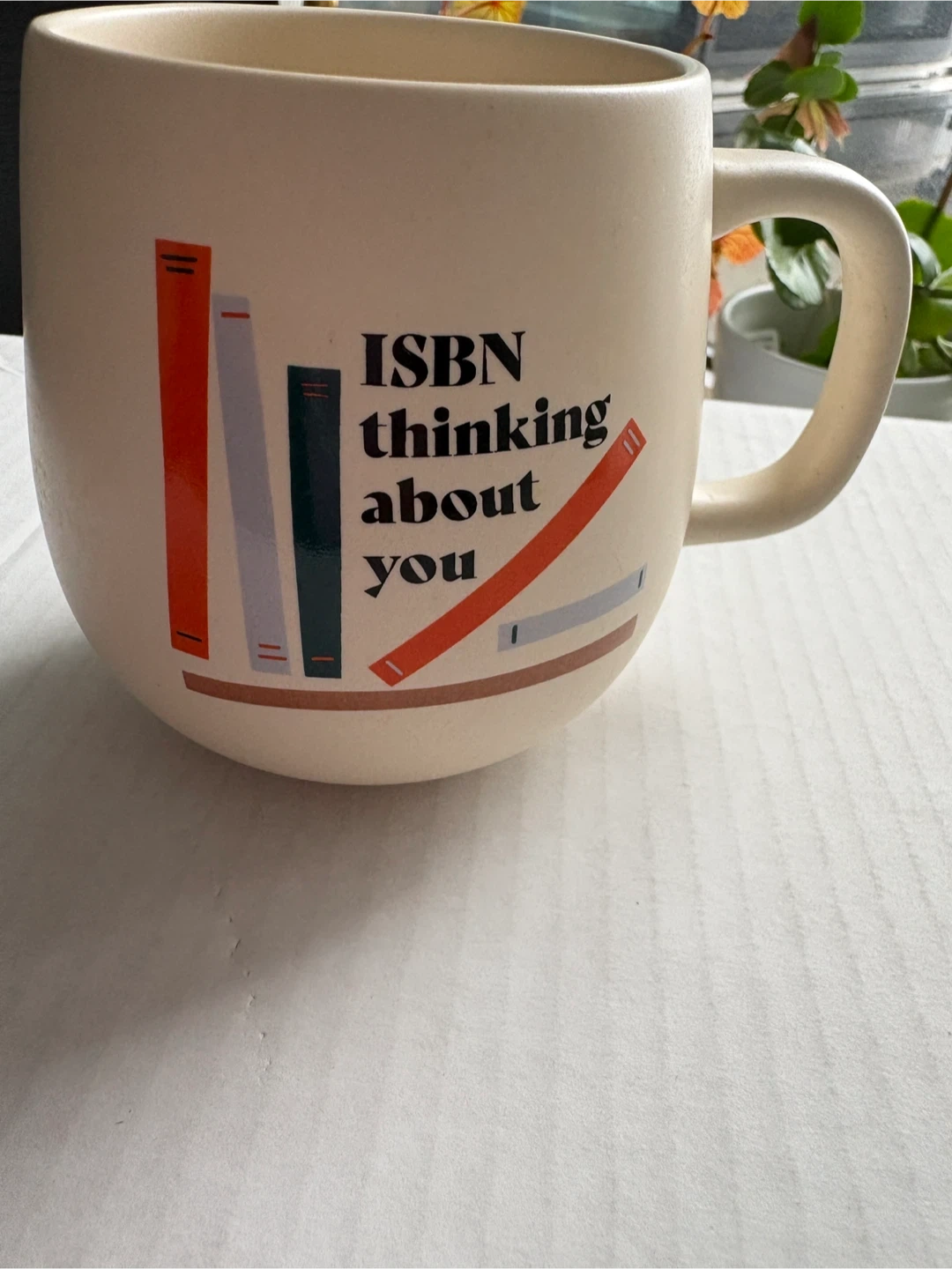 White Indigo mug with a "ISBN thinking about you" graphic featuring books. It's dishwasher and microwave safe. Made in China.