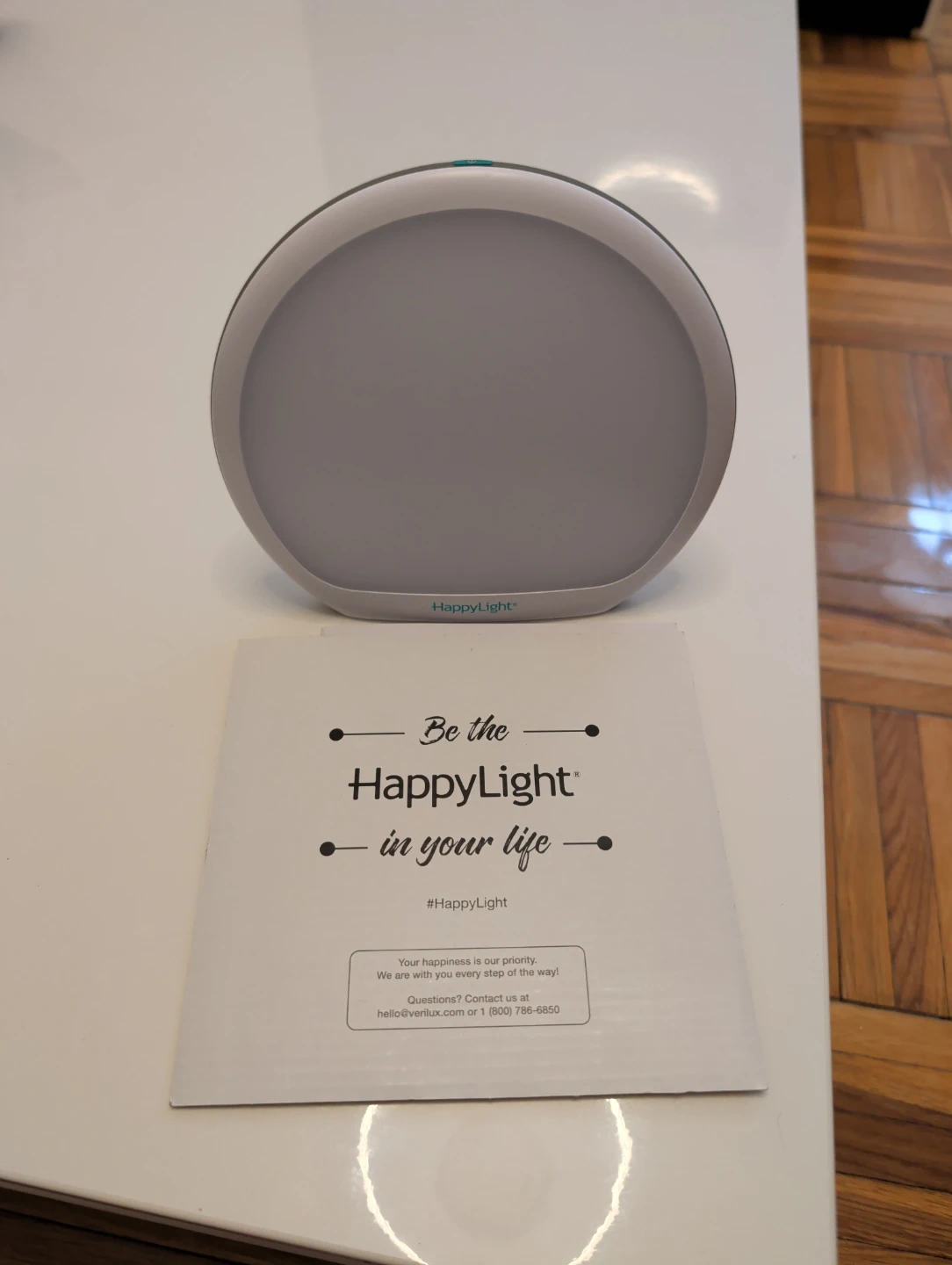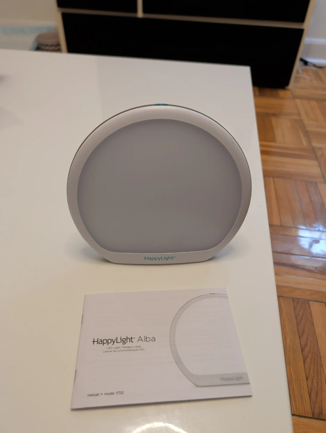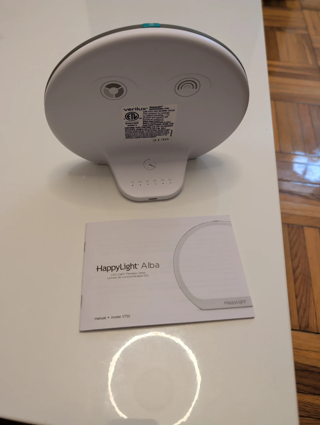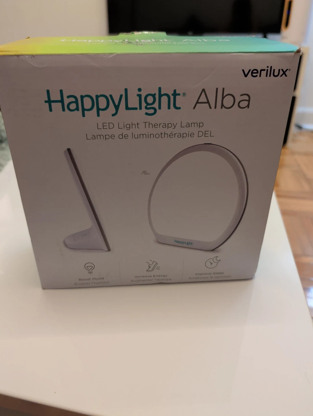 This Verilux HappyLight Alba lamp provides LED light therapy. It comes with its manual and is in its original packaging. This lamp is designed to help improve your mood and energy levels.