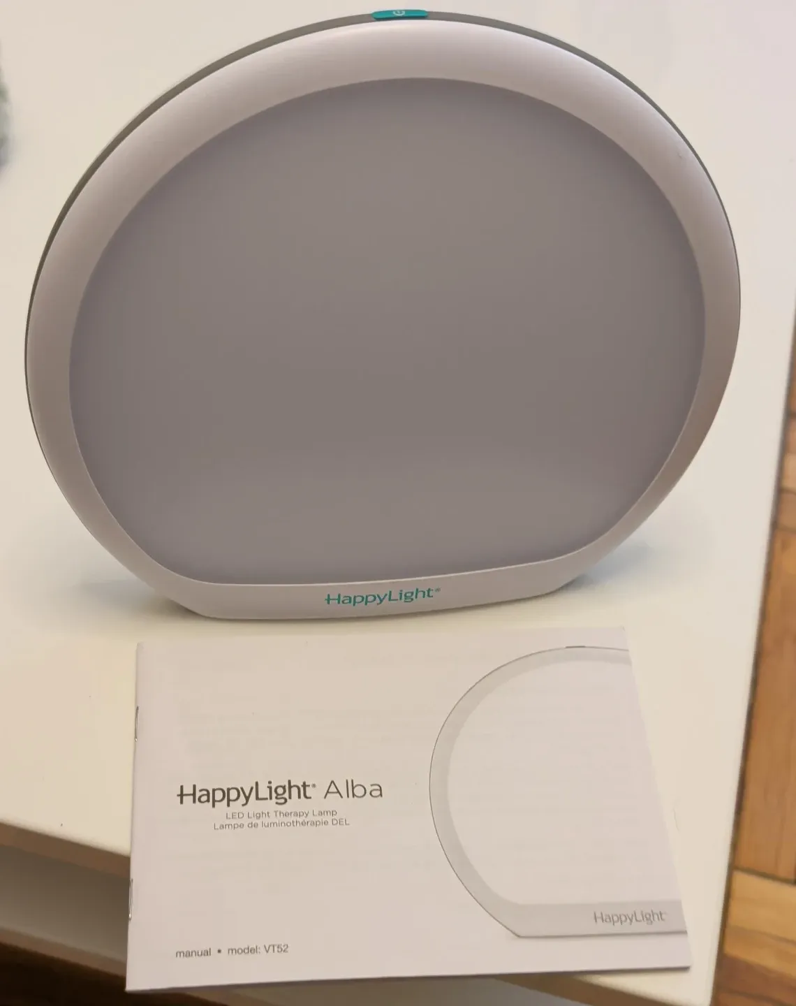 This Verilux HappyLight Alba lamp provides LED light therapy. It comes with its manual and is in its original packaging. This lamp is designed to help improve your mood and energy levels.