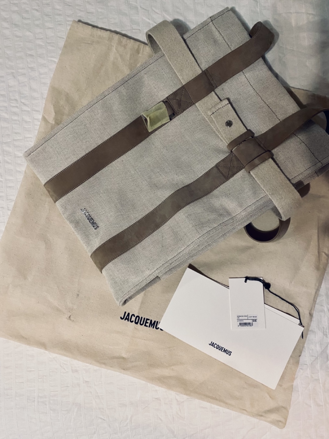 2024 collection. Brand new with tags and dust bag. Excellent construction and quality. Beige/tan/cream canvas tote bag with leather accents. Top handles and shoulder strap.