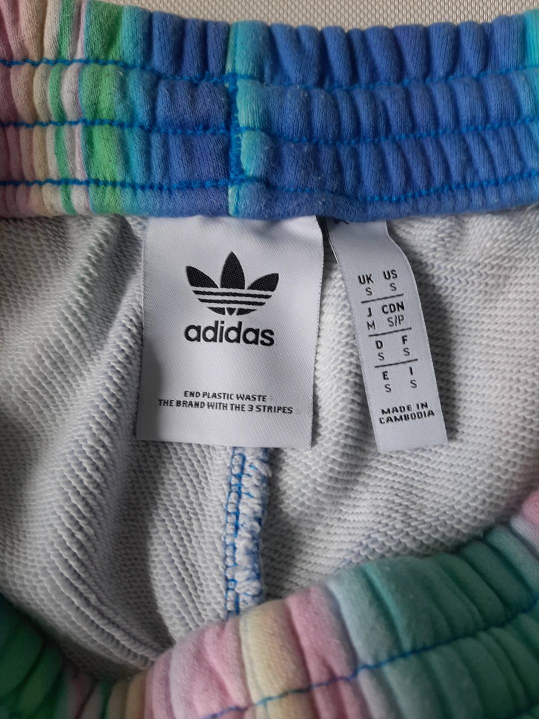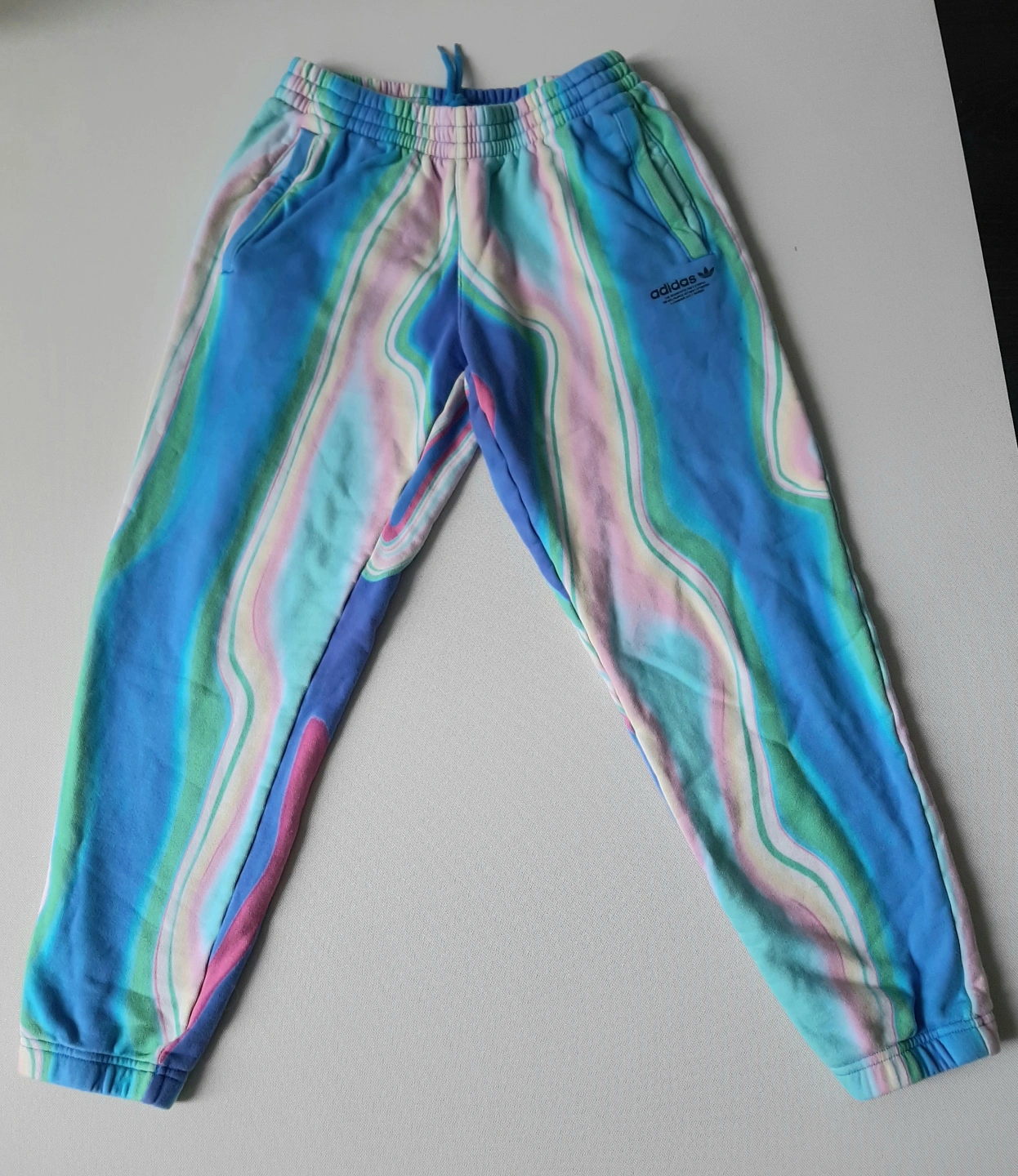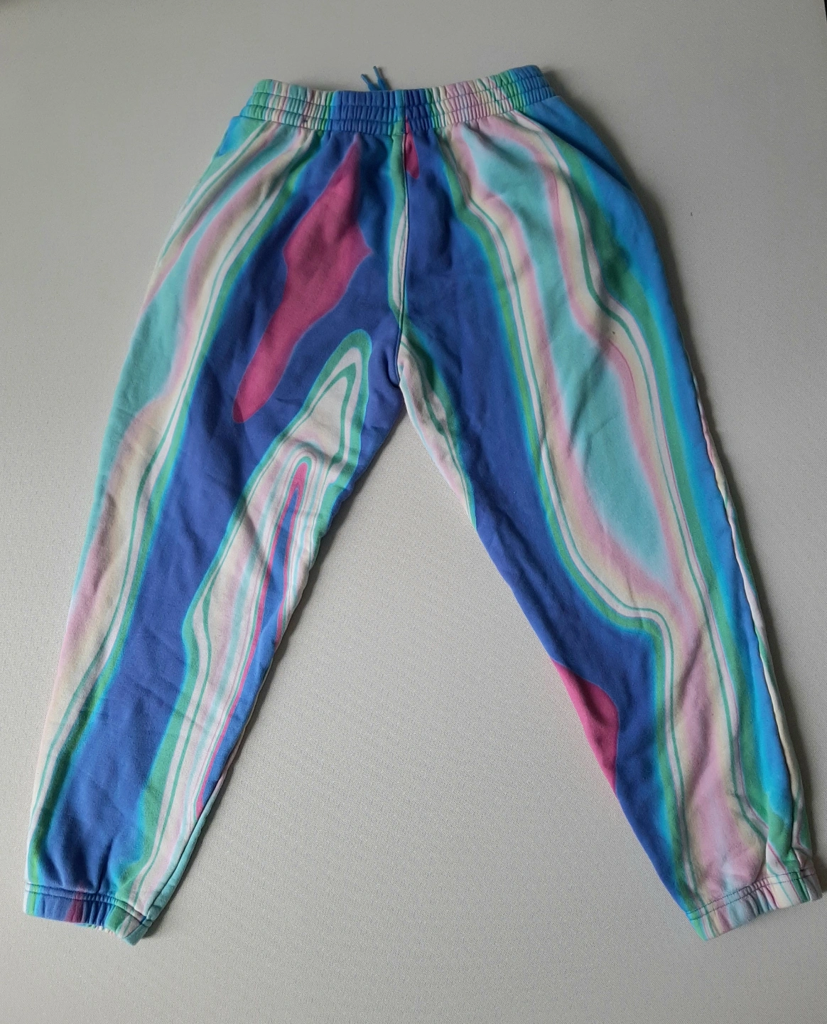 Women's Adidas sweatpants. Size small. Bright blue, pink, and green tie-dye pattern. Elastic waistband and cuffs. Made in Cambodia.