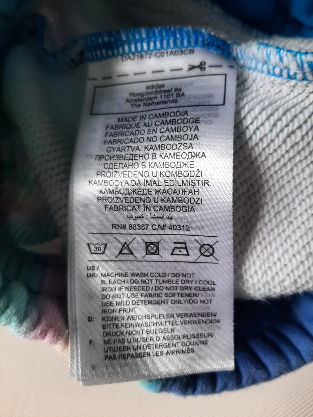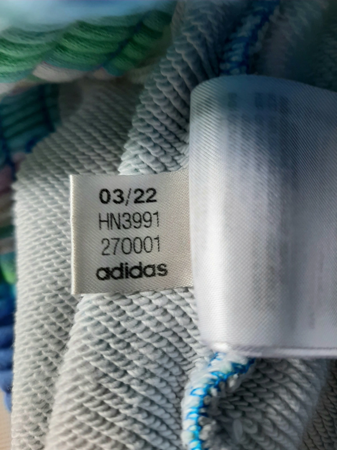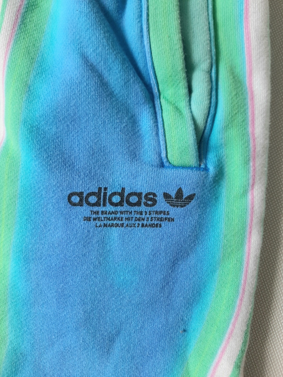 Women's Adidas sweatpants. Size small. Bright blue, pink, and green tie-dye pattern. Elastic waistband and cuffs. Made in Cambodia.
