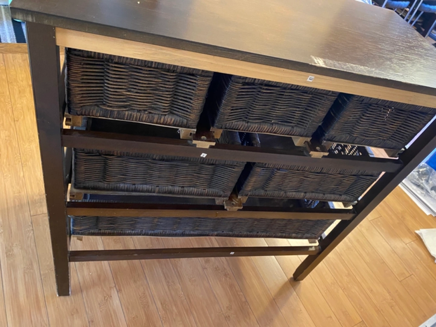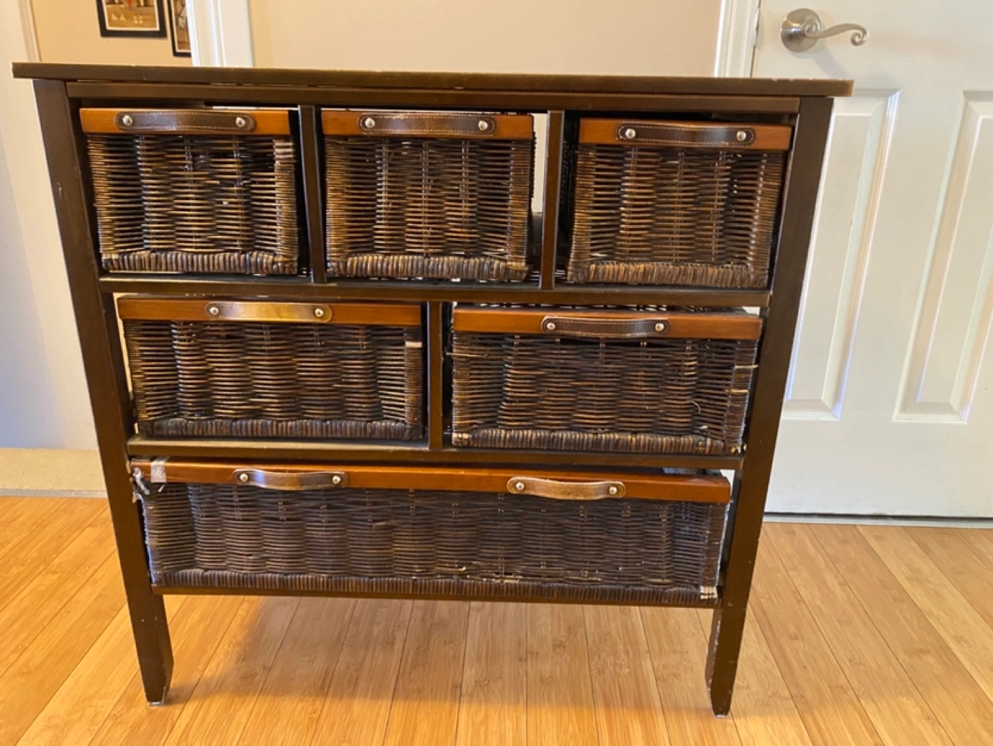 Six-drawer unit with woven wicker drawers. Dark brown stained wood frame.