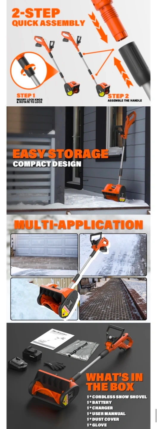 * Includes: 20V 12-inch electric cordless snow shovel, quick charger, snow shovel cover, and gloves