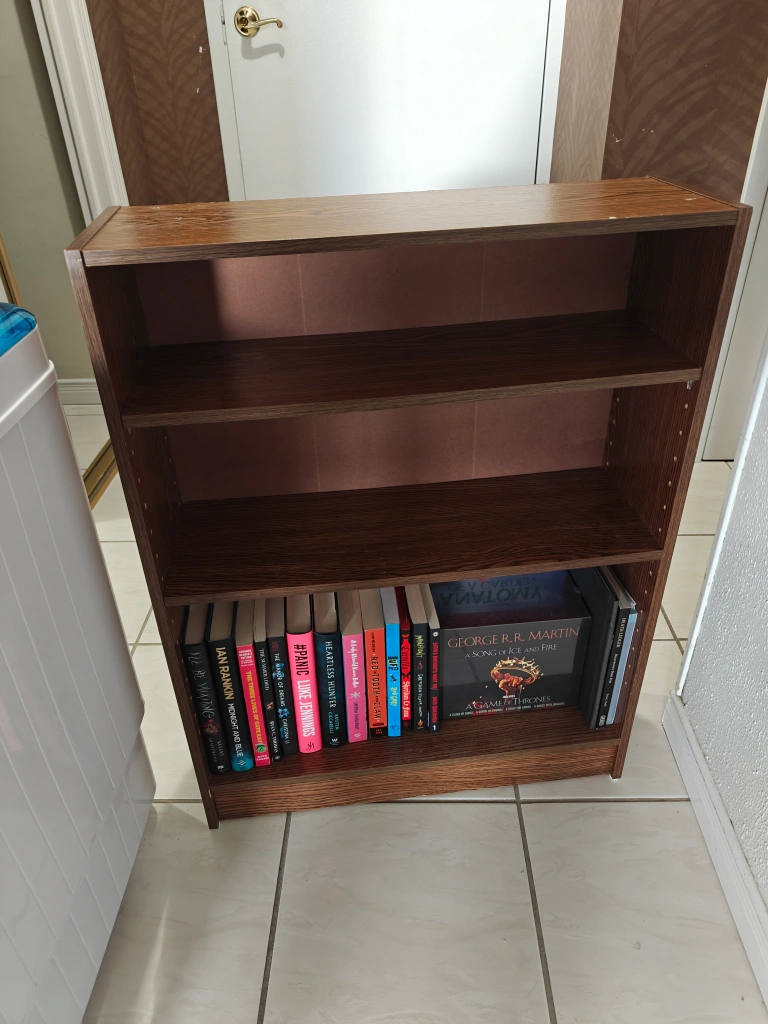 Selling a sturdy brown wooden bookcase. It has three shelves, perfect for storing books or displaying your favourite items. It's in good condition and ready for a new home!