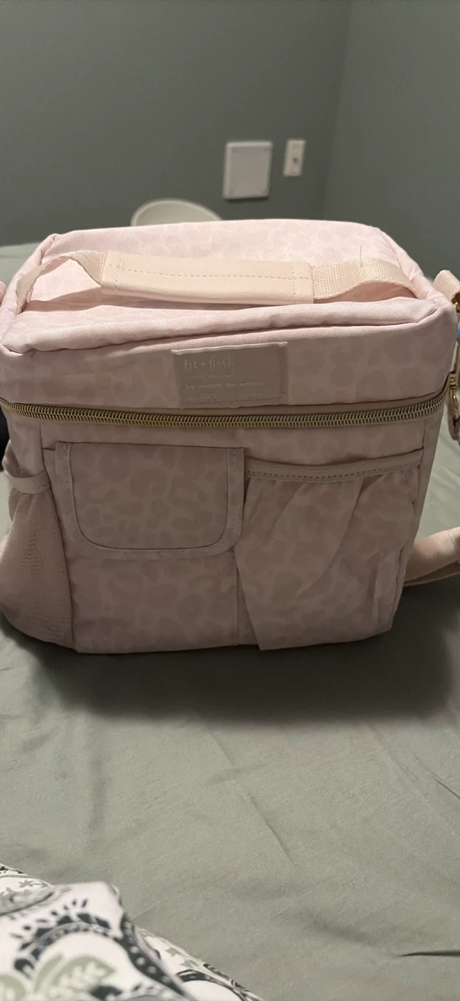 This Fit+Fresh lunch bag is pink with a leopard print. It features a main zippered compartment and a front pocket. Great for packing lunches or snacks for work or school!
