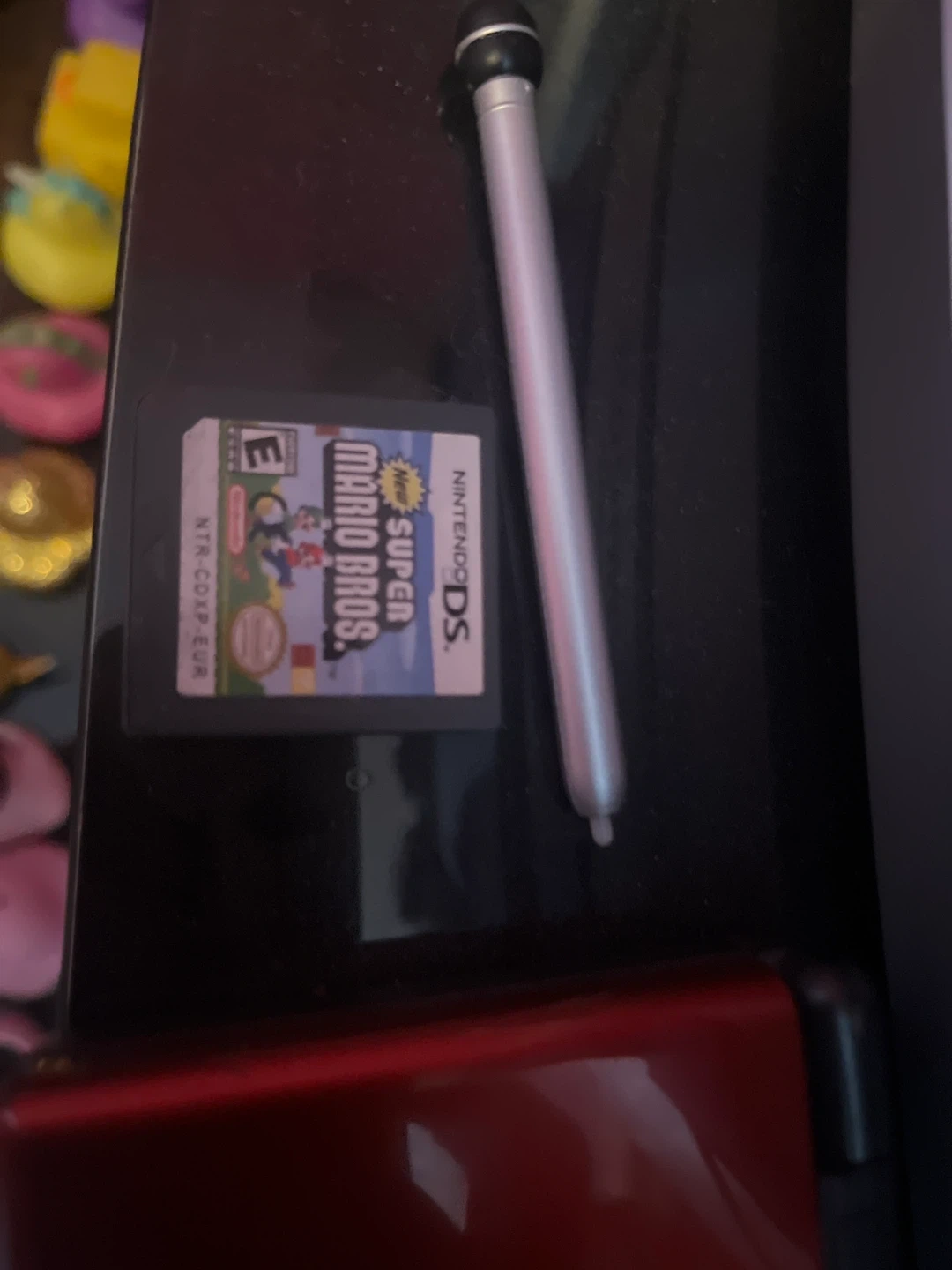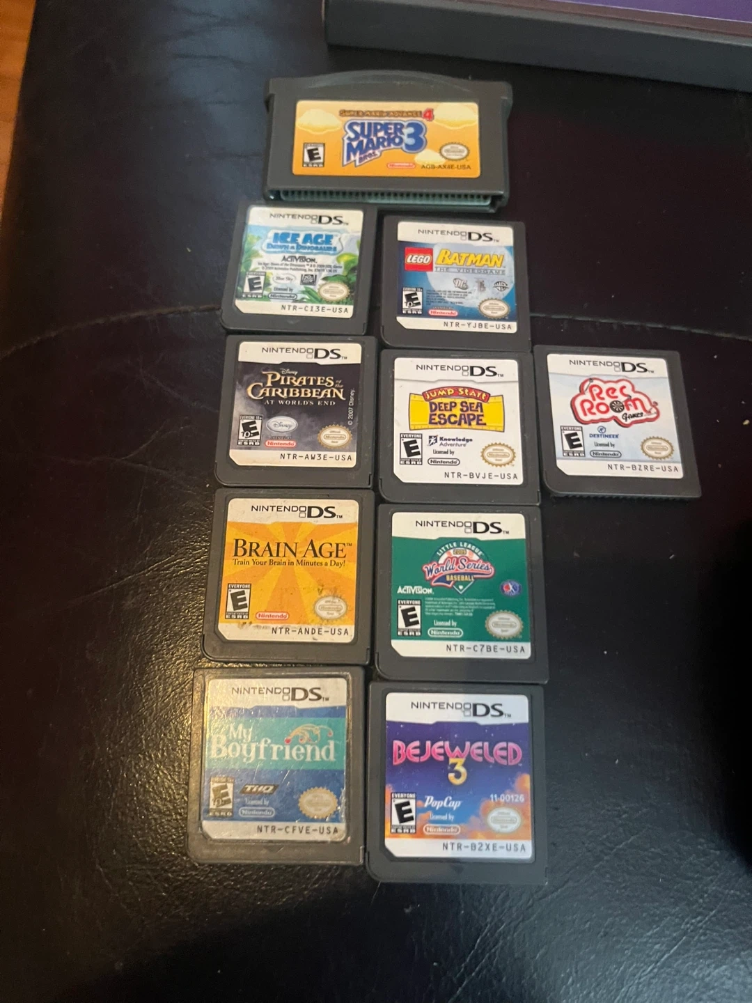 This bundle includes a red Nintendo DS, multiple DS games like Super Mario 3, Ice Age, Batman, Pirates of the Caribbean, and Guitar Hero. It also comes with the Guitar Hero on Tour accessories (bundle) and a charger.