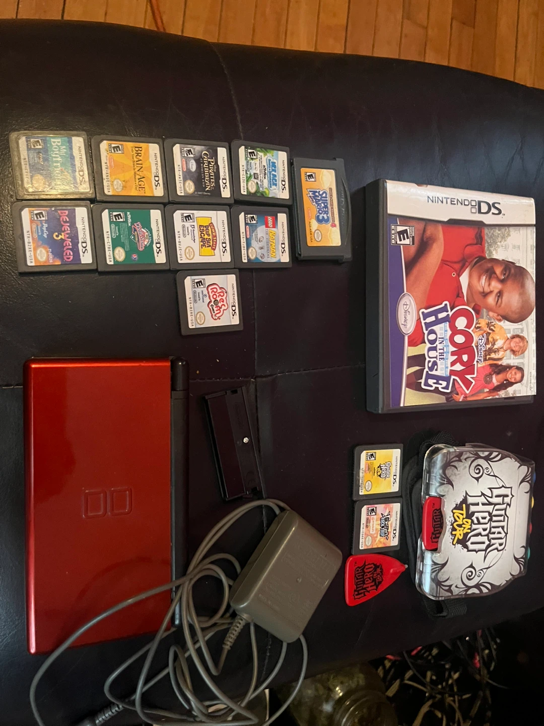This bundle includes a red Nintendo DS, multiple DS games like Super Mario 3, Ice Age, Batman, Pirates of the Caribbean, and Guitar Hero. It also comes with the Guitar Hero on Tour accessories (bundle) and a charger.